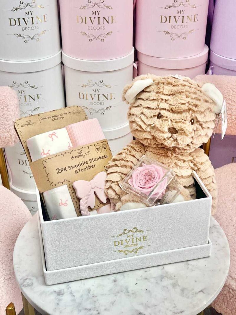 โA charming baby gift box featuring a preserved rose in an elegant acrylic box, a soft baby blanket, and an adorable teddy bear decorated in a box. A thoughtful keepsake set to celebrate lifeโs sweetest moments. Please note: Colors and styles may vary based on availability.โ