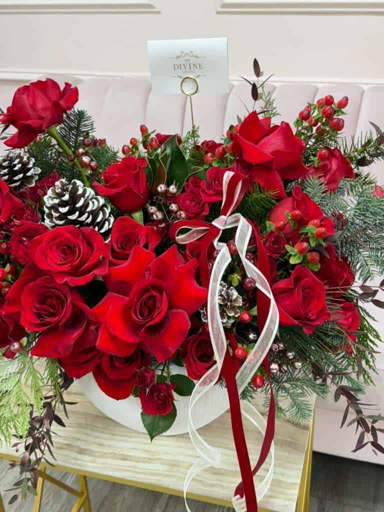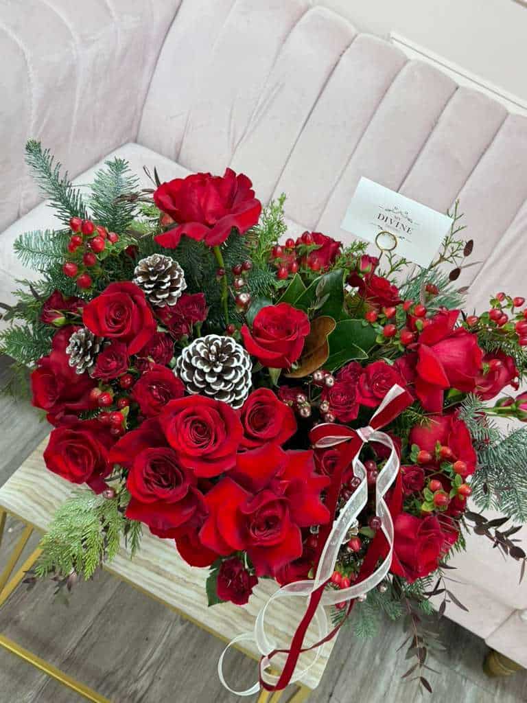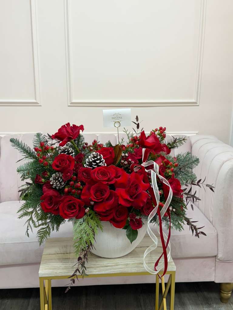 Make a timeless statement with this luxurious holiday arrangement, designed with premium red roses nestled among fresh winter greens. Accented with seasonal elements like pinecones, hypericum berries, and delicate foliage, this design captures the warmth, elegance, and magic of the holidays. Finished with a festive ribbon and arranged in a modern white ceramic container, it’s perfect for Christmas décor, special celebrations, or sending a heartfelt seasonal gift.