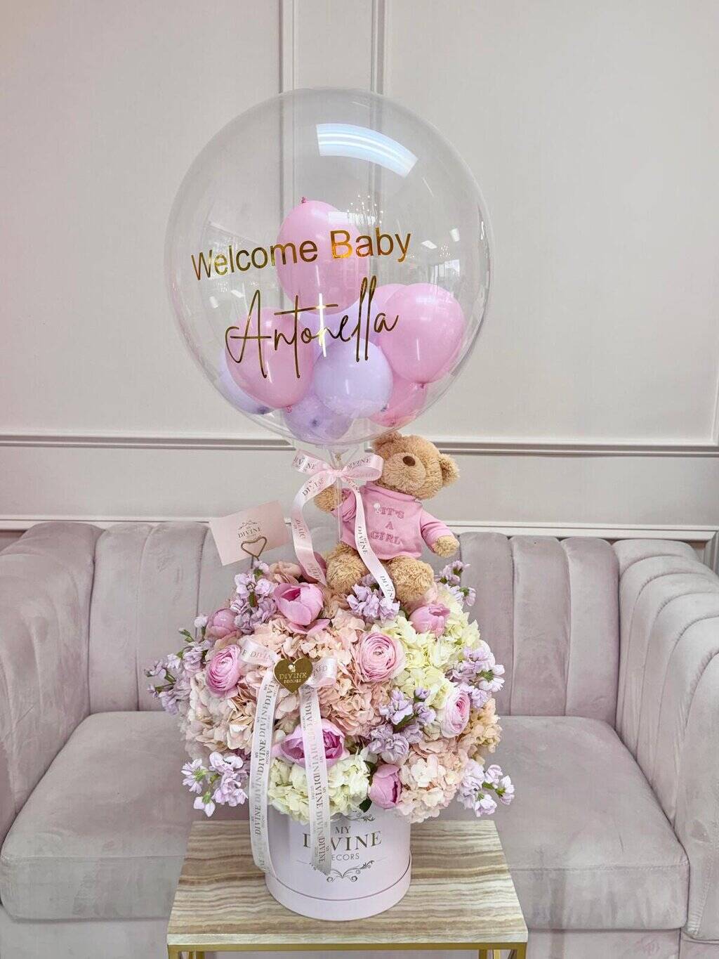 Un personalizad globo jumbo con mini globos en tonos pastel flota sobre las flores, mostrando el nombre del bebé en elegantes letras doradas. Un osito de peluche vistiendo «It’s a Girl» añade el toque de recuerdo más dulce, junto con cintas de satén personalizadas y nuestros detalles signature Divine.