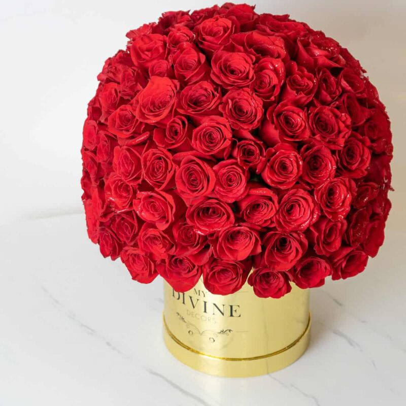 Las flores se posicionan hacia el frente del arreglo, estilo caja redonda.