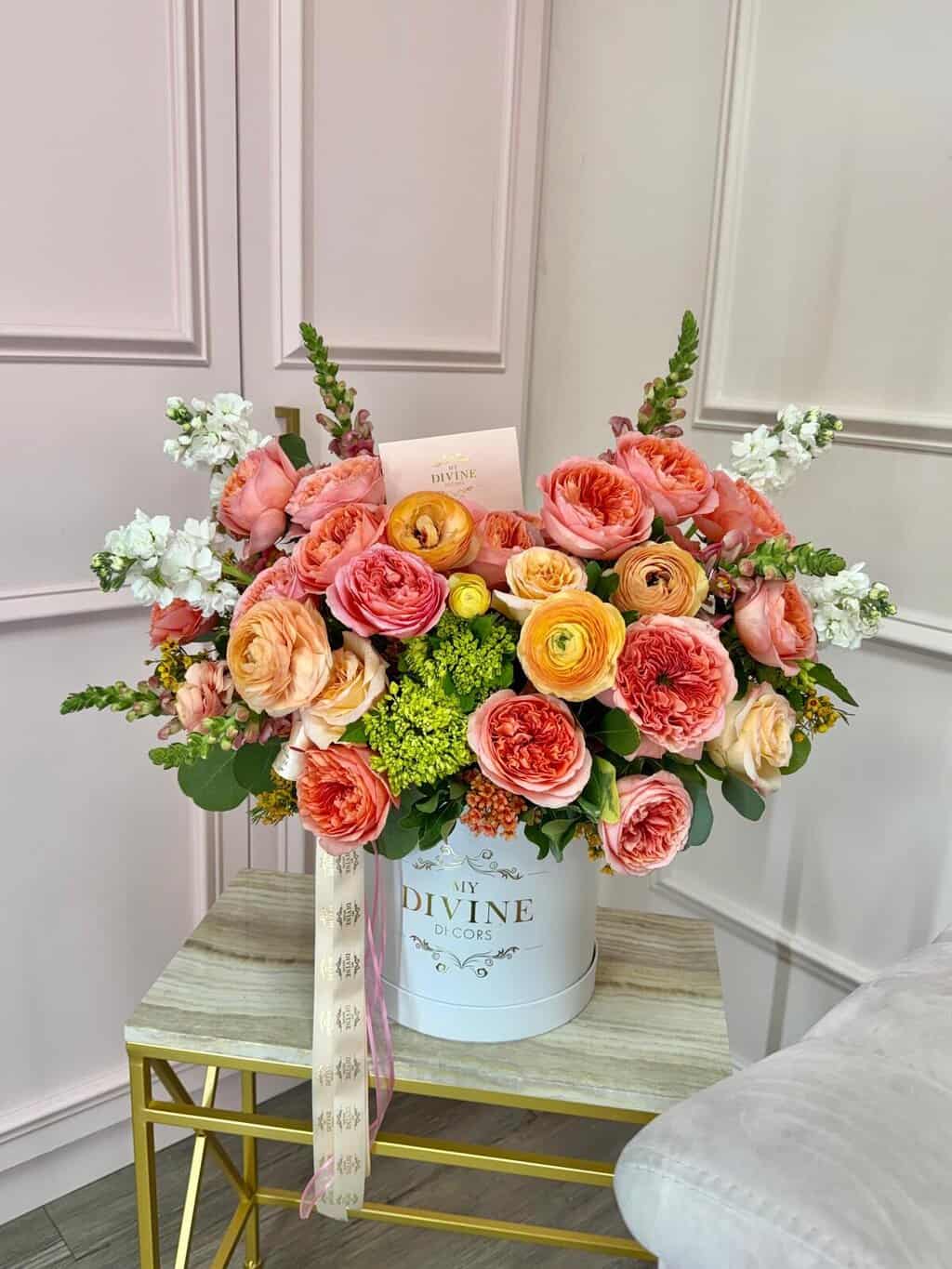 Una mezcla onírica de elegancia y alegría, nuestra Caja Redonda Jardín Melocotón Lujo está diseñada para iluminar cualquier espacio con su selección radiante de flores y paleta de colores fresca y estimulante. Presenta una exuberante combinación de rosas de jardín premium, rosas spray, ranúnculos, flores de dragón y acentos estacionales en tonos de melocotón, coral y cítricos suaves, esta pieza floral aporta un toque instantáneo de calidez y sofisticación.