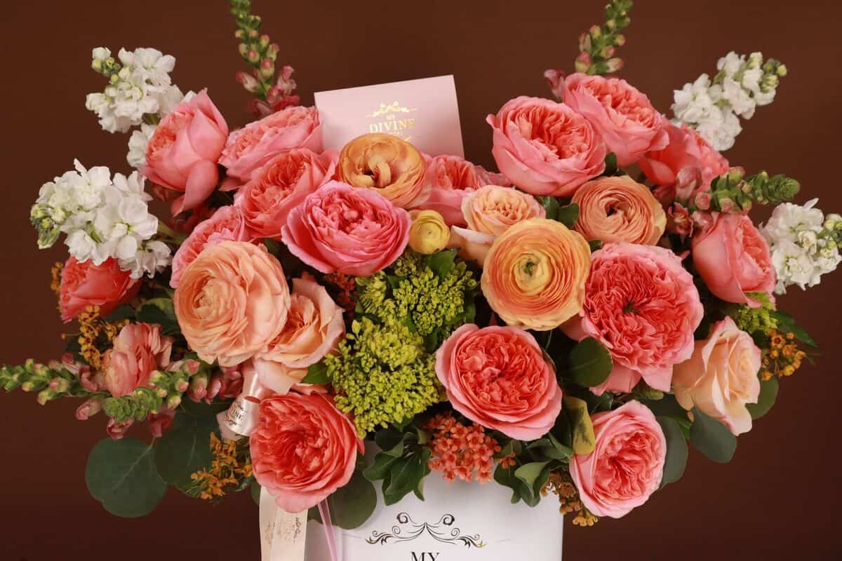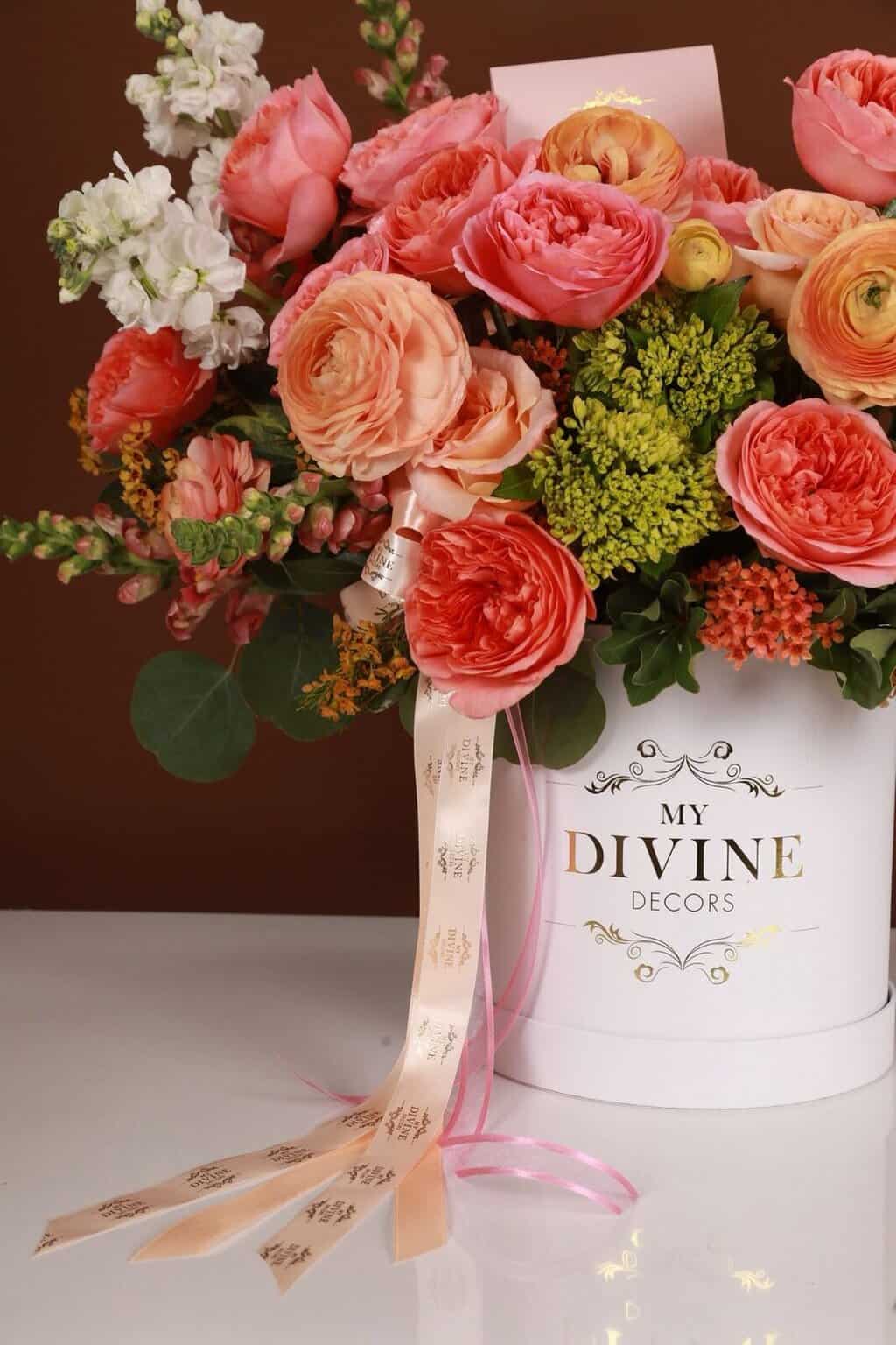 Arreglada en nuestra distintiva caja redonda blanca de My Divine Decors con detalles dorados y rematada con nuestro listón de satén personalizado, este diseño ofrece tanto belleza como refinamiento — convirtiéndola en el regalo perfecto para cumpleaños, celebraciones, deseos de recuperación, obsequios corporativos, o simplemente porque sí.