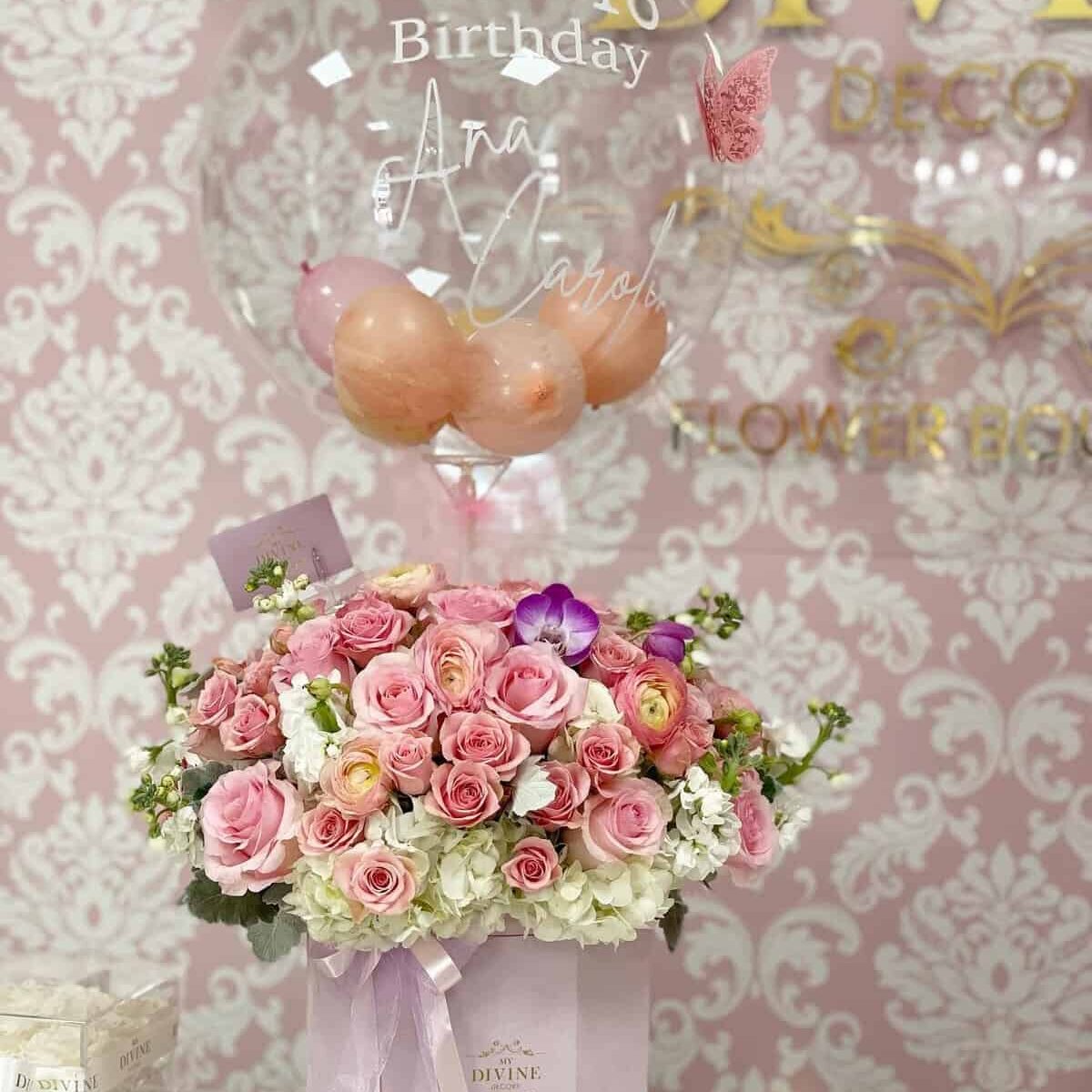 Las flores se posicionan al frente del arreglo, en estilo caja redonda.