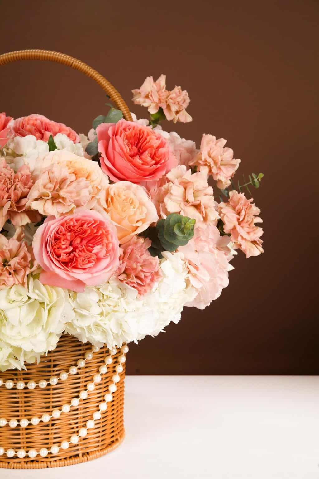 Una exquisita canasta de lujo rebosante de rosas de jardín premium, hortensias y flores de temporada en tonos románticos de marfil, sonrosado, melocotón y coral.