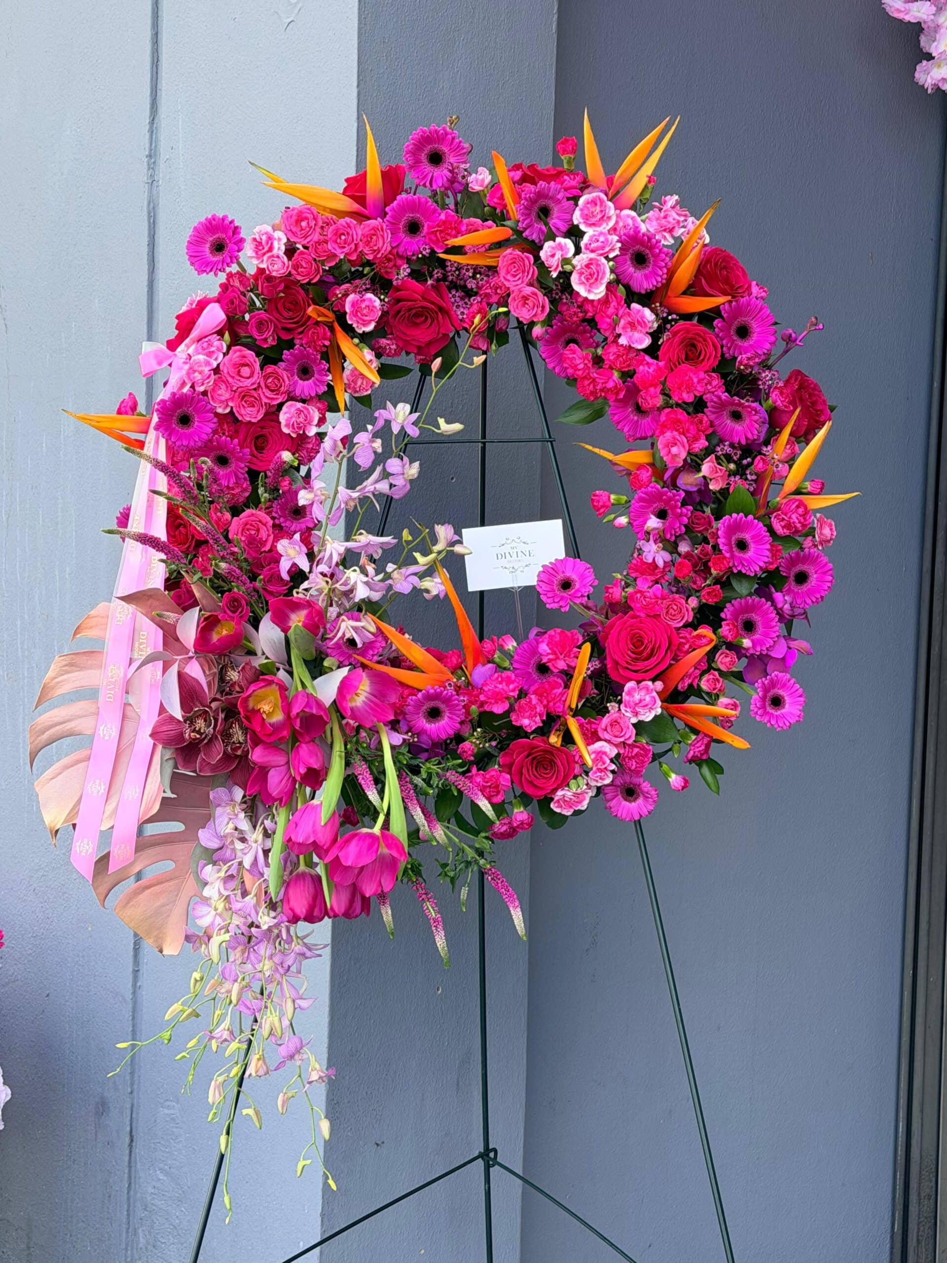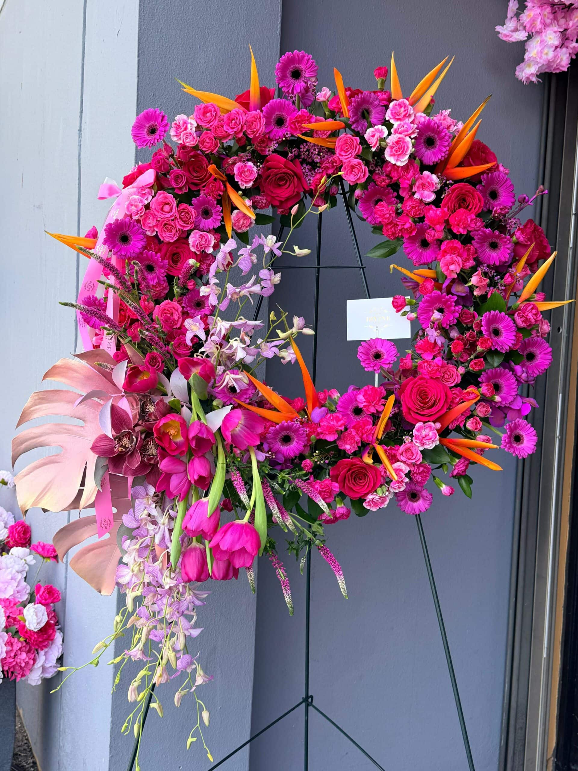 Nuestra Corona Tributo Tropical Divine es un diseño impresionante de círculo abierto desbordante de vibrantes rosas rosadas, rosas spray, margaritas gerbera, claveles y orquídeas dendrobium en cascada. Las llamativas Aves del Paraíso añaden un toque exótico, aportando calidez, fuerza y energía radiante a esta pieza única.