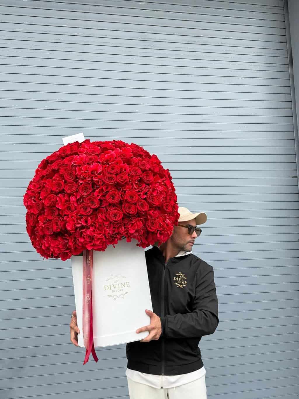 Una verdadera declaración de amor y lujo. Este arreglo de gran tamaño presenta aproximadamente 150 rosas premium, diseñadas artísticamente con exuberantes hortensias frescas cortadas para crear una cúpula abundante y elegante que deja una impresión duradera. Presentado en nuestra característica caja de gran tamaño My Divine Decors, terminada con delicados detalles de cinta, esta pieza está hecha para detener corazones y llamar la atención.