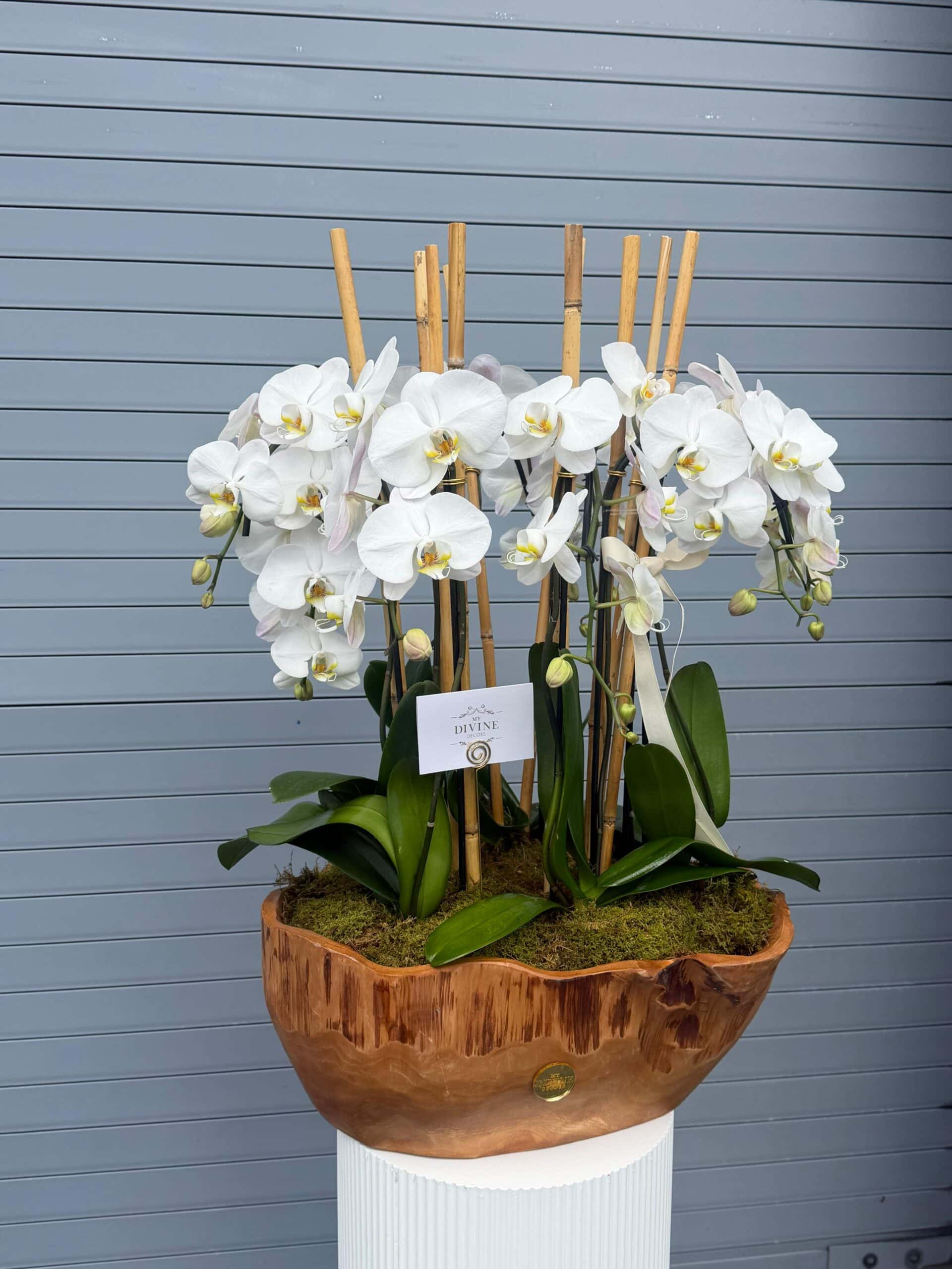 Arreglo Premium de Orquídeas Phalaenopsis en jarrón de madera tallada a mano