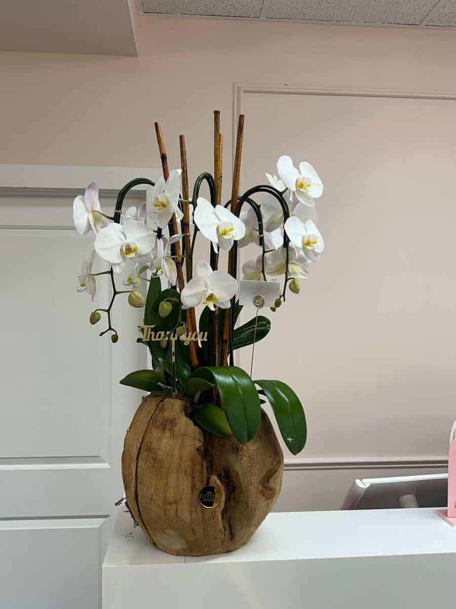 Orquídeas Swan en Florero de Madera Mediano