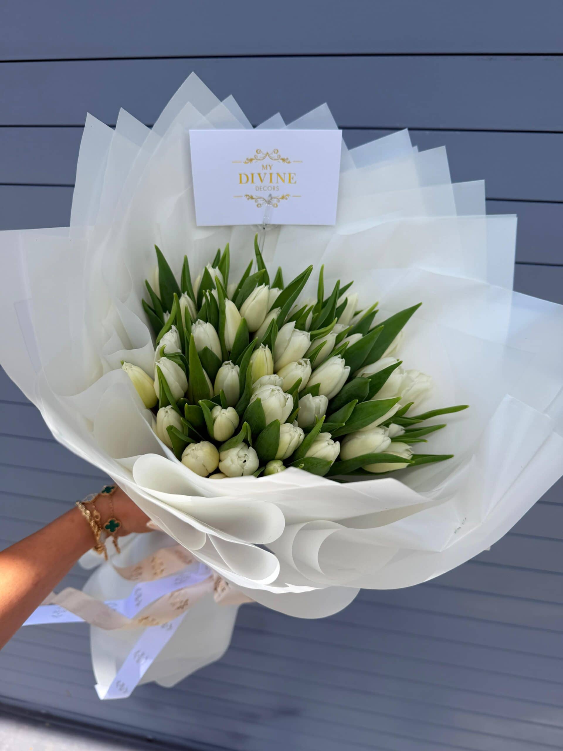 Se trata de un ramo de mano envuelto con tulipanes frescos. Tenga en cuenta que estas flores vienen sin agua. Por favor, indique su color preferido y la cantidad de tulipanes para su ramo.