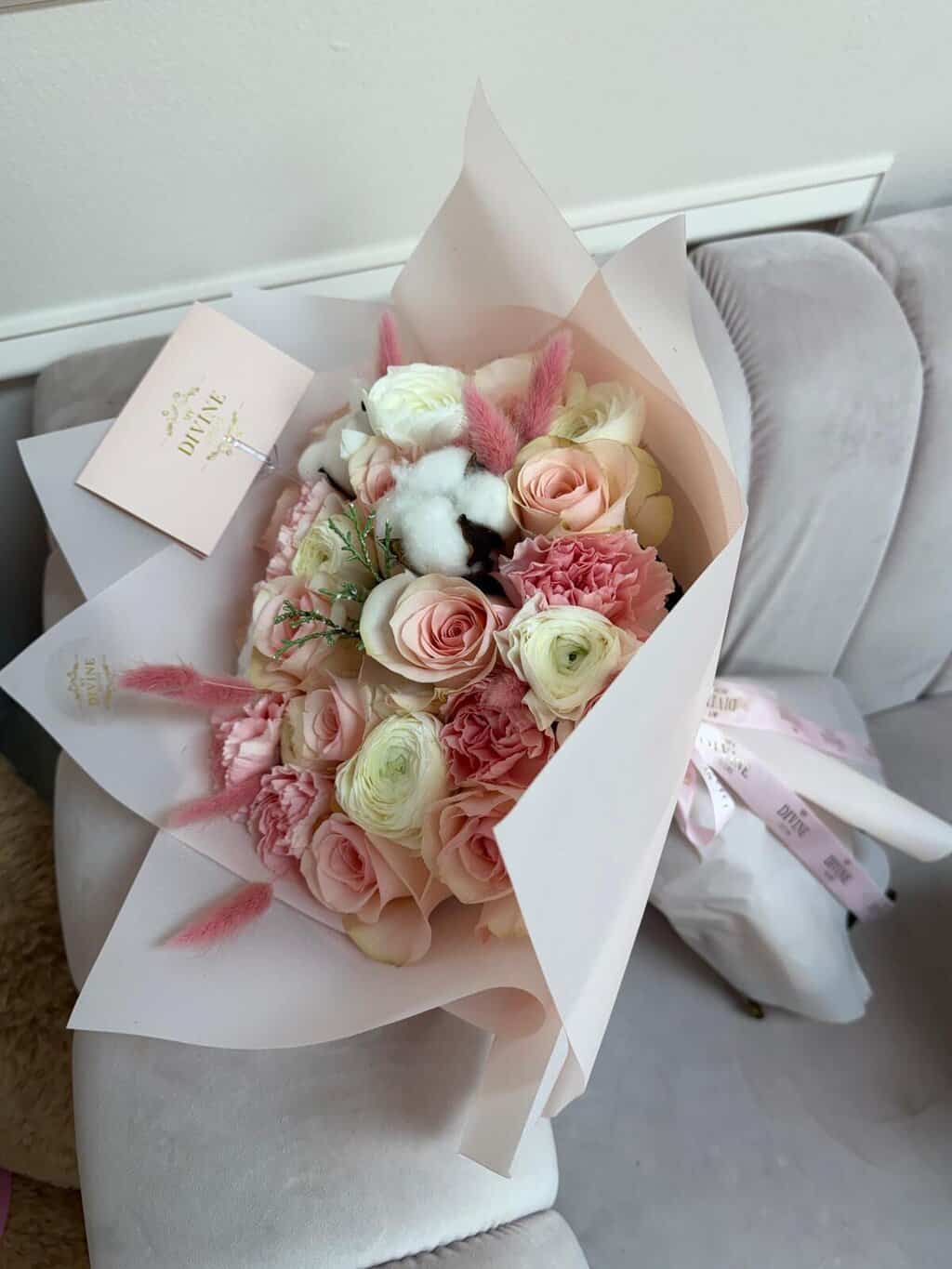 Suave, romántico y lleno de encanto — este ramo navideño combina tonos delicados de blush, marfil y rosa pastel para una apariencia festiva con un toque femenino. Diseñado con rosas Premium, ranúnculos, claveles y tallos de algodón, se completa con nuestro distintivo envoltorio rosa My Divine Decors y cinta de satén para un toque de ensueño.