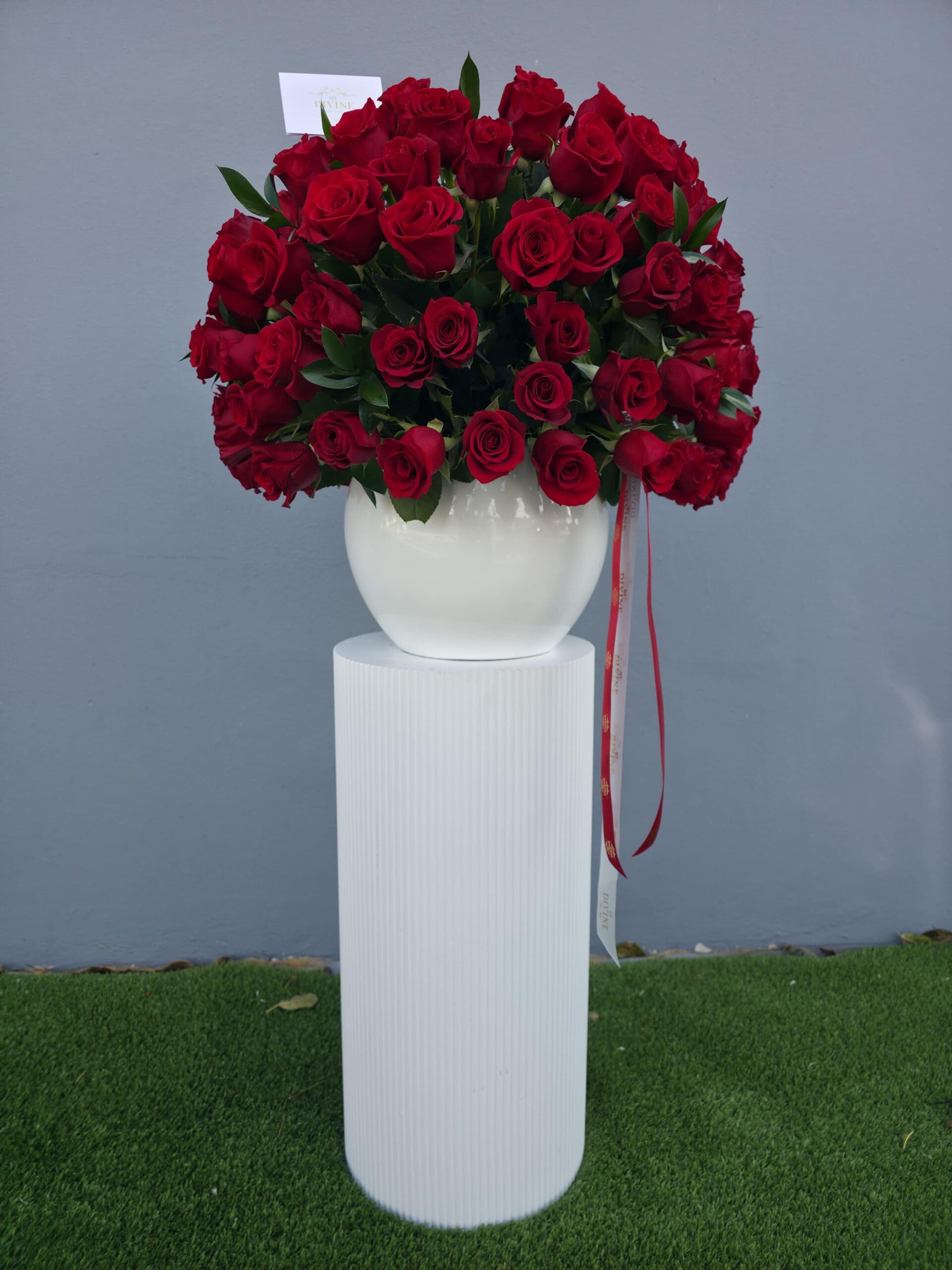 Los colores y tipos de rosas pueden variar según la temporada y disponibilidad. Por favor indique sus preferencias de color. Incluye 120-130 Rosas Frescas y Ruscus israelí verde o plateado/dorado. Floreros disponibles en blanco, plateado y dorado. Inventario limitado.