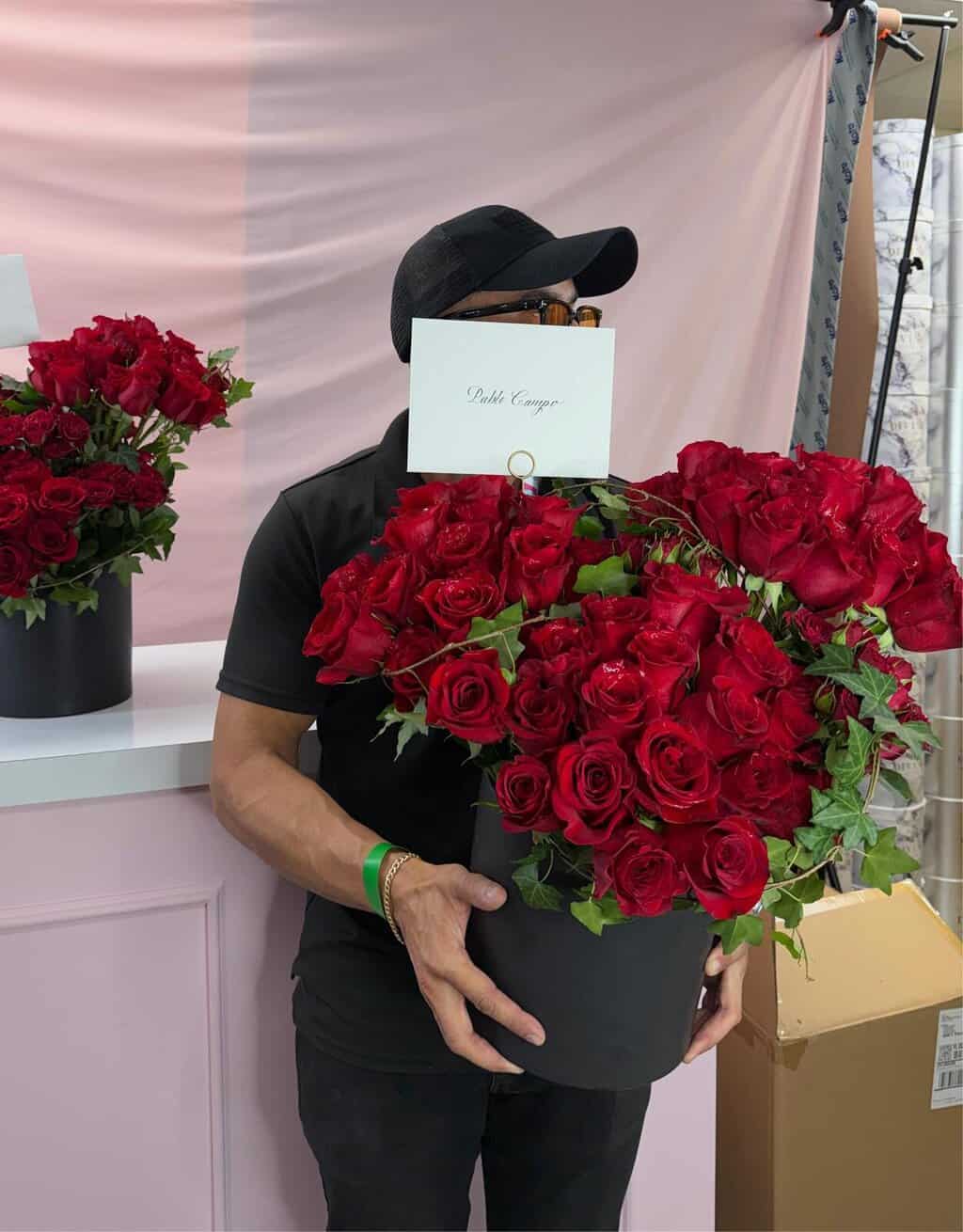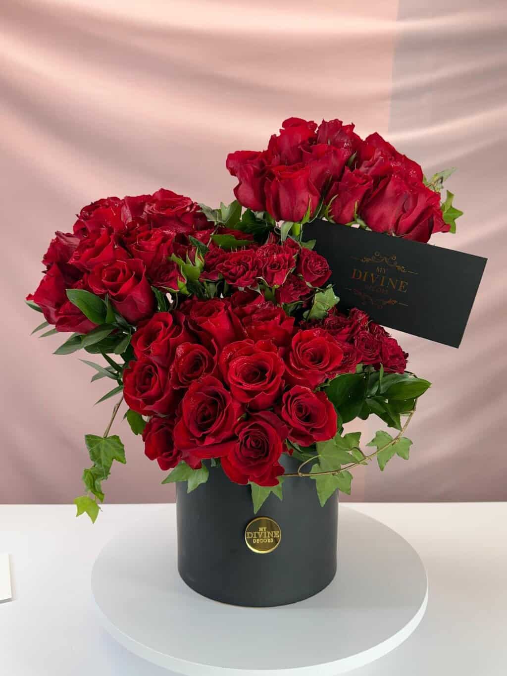 Una expresión audaz y atemporal del amor, este deslumbrante arreglo presenta una abundante selección de rosas Premium rojas, diseñadas artísticamente para crear una silueta completa y elevada. Acentuado con frondoso follaje e hiedra en cascada para un toque natural y romántico, las flores están arregladas en un elegante florero cilíndrico negro que realza la riqueza de los pétalos rojos. Perfecto para aniversarios, gestos románticos o celebraciones elegantes, este diseño hace una declaración inolvidable.