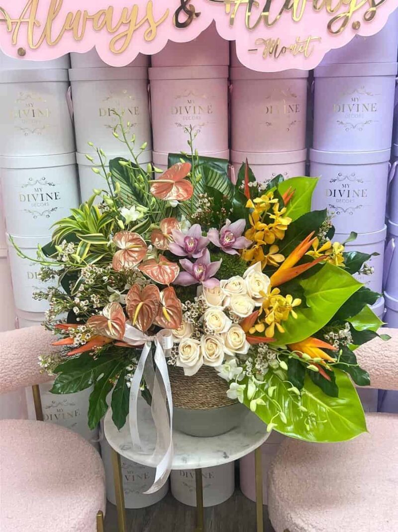 โA vibrant tropical flower arrangement featuring a mix of bold and exotic blooms, artfully arranged in a vase. Flowers and colors may vary based on seasonal availability. Fresh flowers are perishable.โ