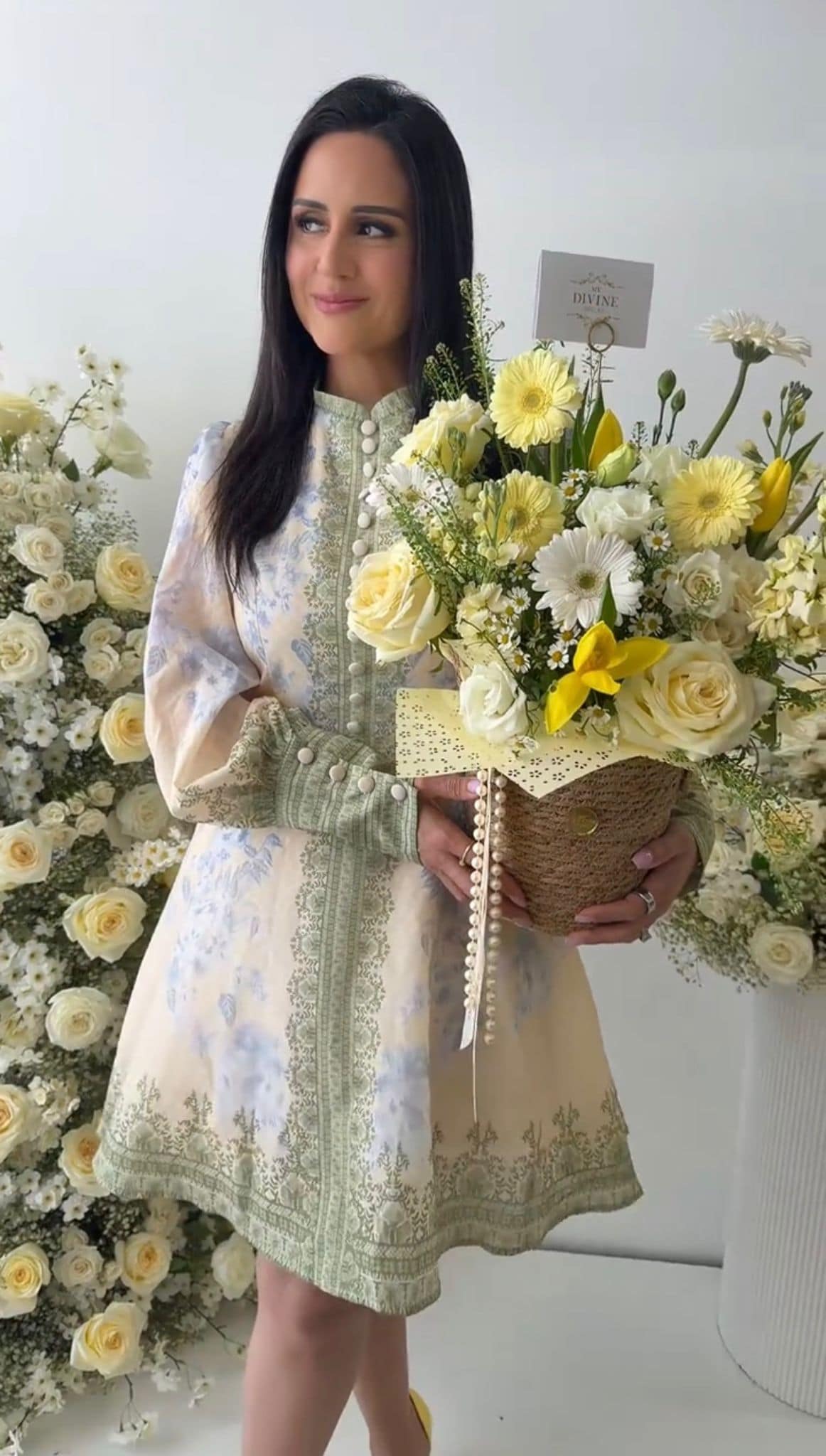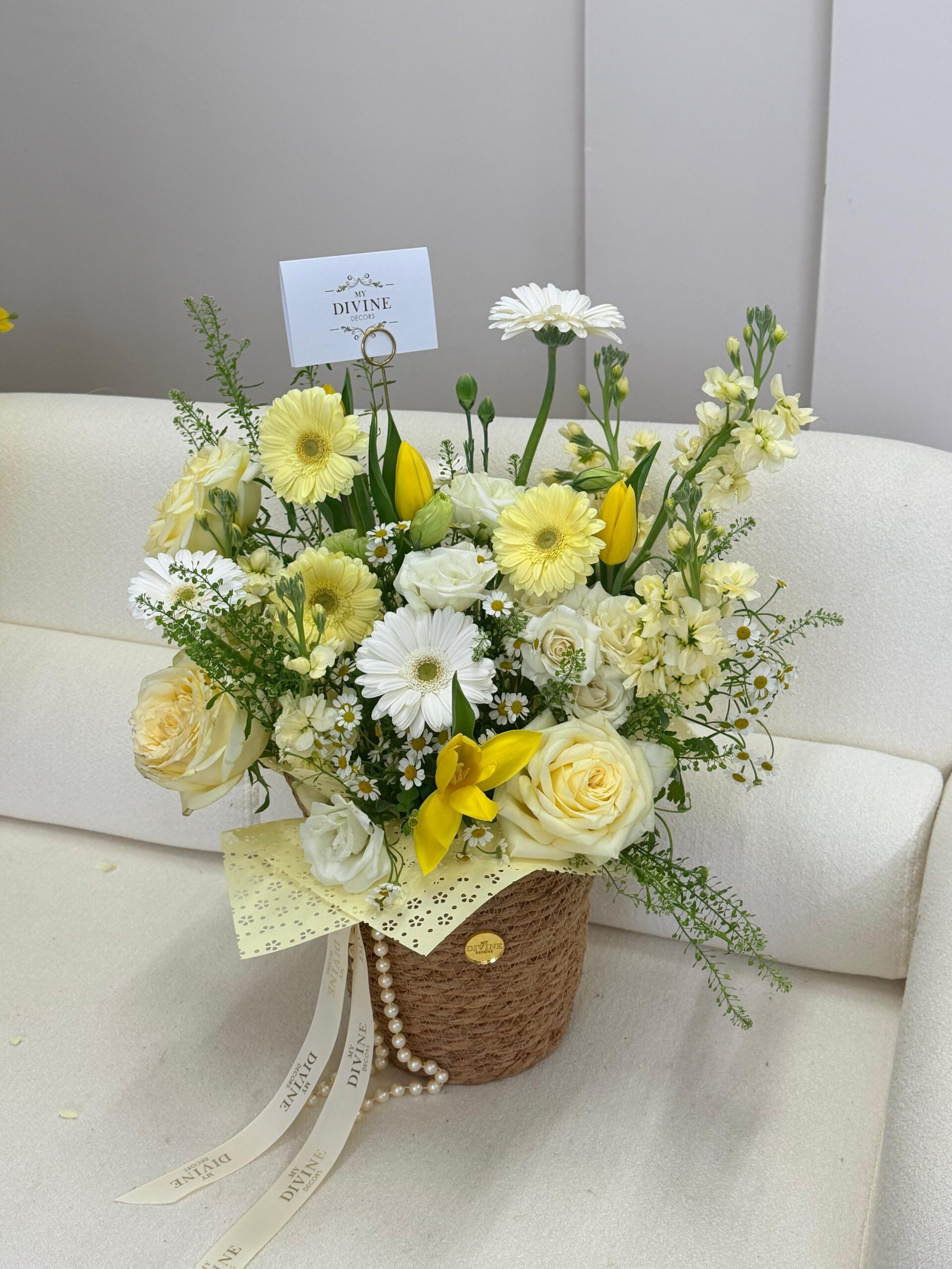 Arranged in a textured woven basket and wrapped in our signature waterproof Korean paper, this piece is finished with a pearl-accent ribbon and our elegant Divine card โ adding a romantic, feminine touch to every detail.