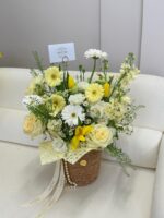 Soft, delicate, and effortlessly elegant โ the Golden Whisper Basket is a charming arrangement designed to bring warmth and grace to any moment. Featuring a beautiful blend of ivory roses, creamy spray roses, soft yellow gerbera daisies, seasonal blooms, and airy fillers, this design creates a light, garden-inspired look with a gentle pop of sunshine.