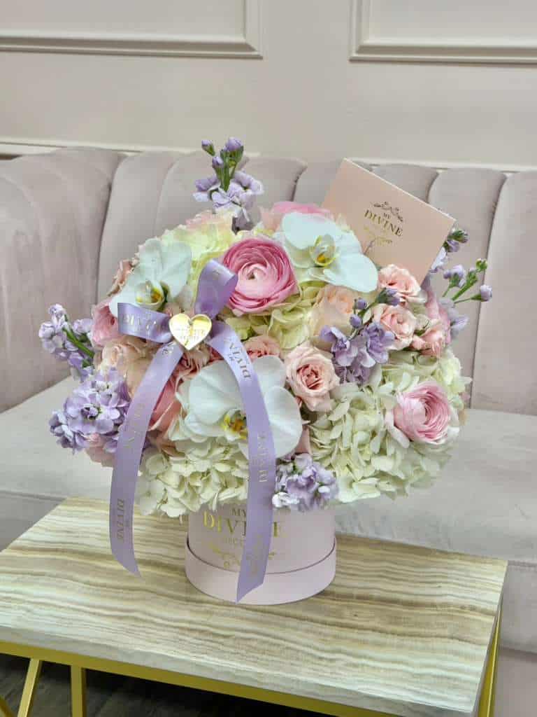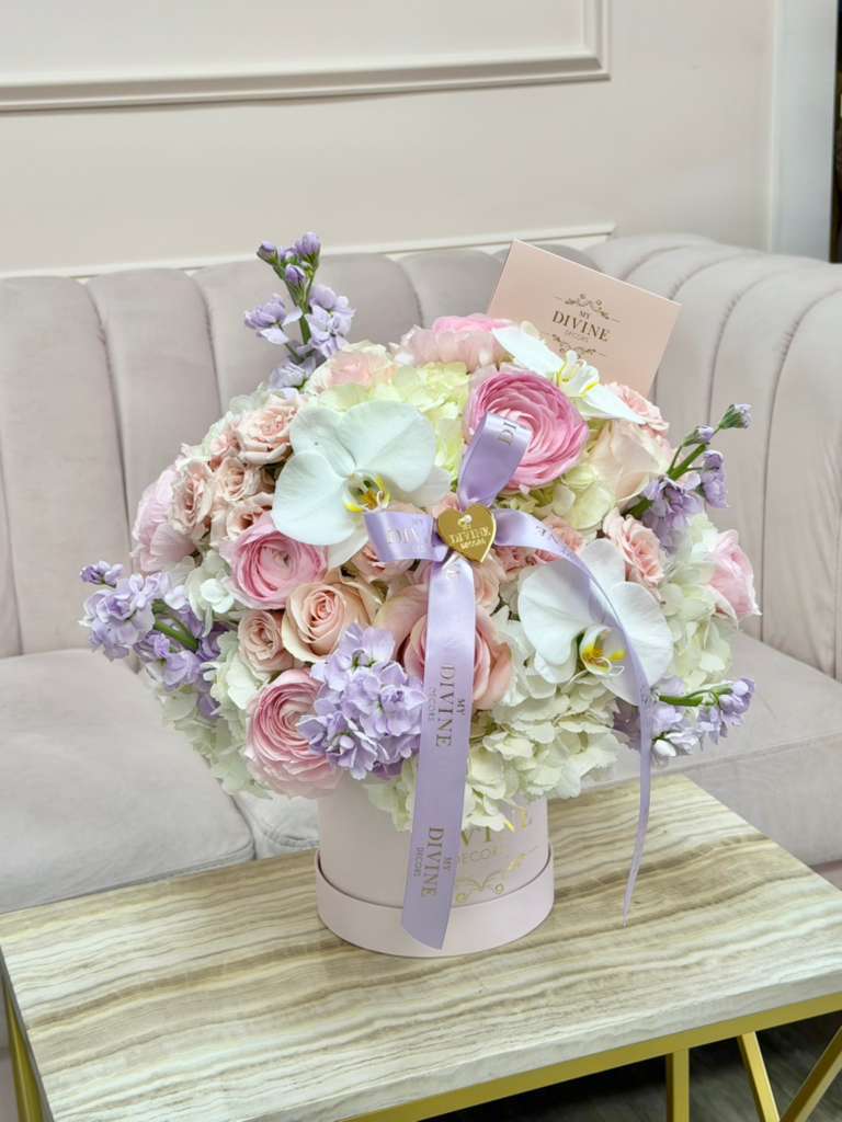 Delicate, romantic, and beautifully refined, this luxurious arrangement features a harmonious blend of premium blooms in soft blush, ivory, and lavender tones. Designed with roses, spray roses, ranunculus, hydrangeas, orchids, and seasonal florals, each stem is thoughtfully placed to create a full, airy, and feminine composition. Finished with our signature lavender ribbon and presented in our iconic blush Divine box, this arrangement is pure elegance from every angle.