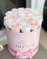 Arrangement contains 18 -20 Preserved roses. 9″x9″ box.