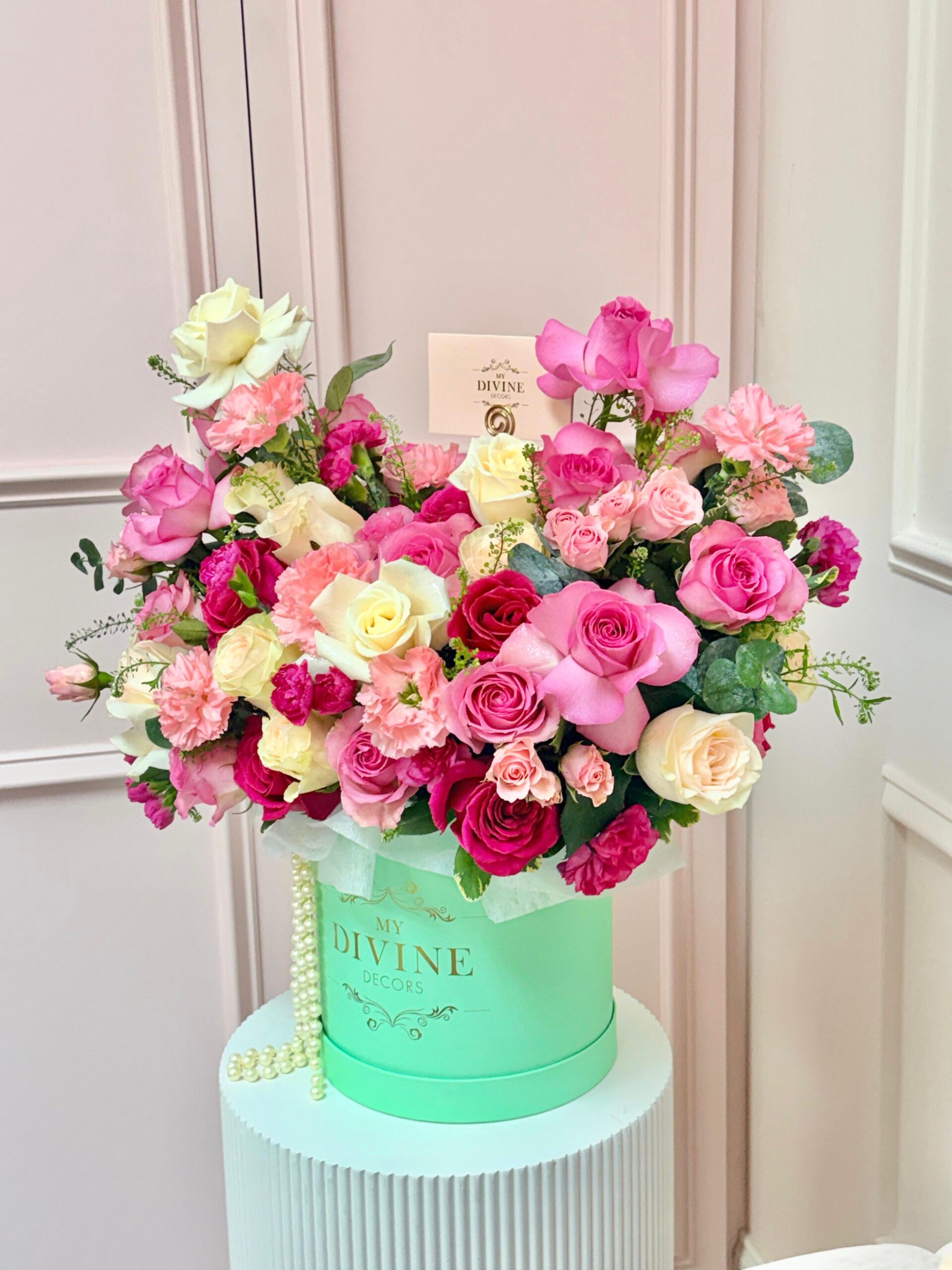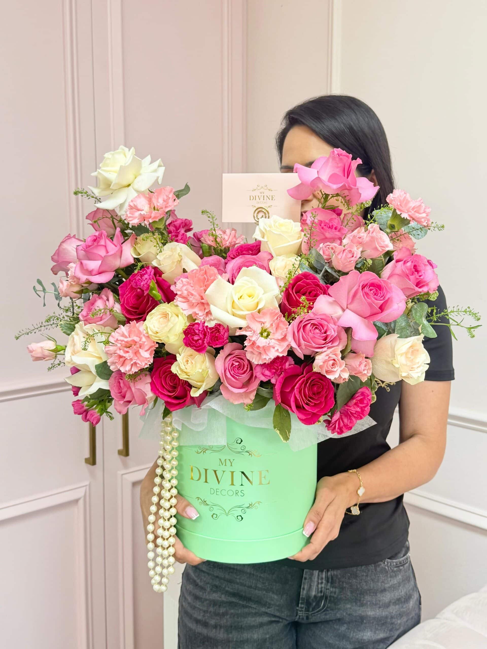 La Vie en Chanel is a celebration of elegance, romance, and timeless beauty. Designed in our signature green hat box, this luxurious arrangement features a dreamy blend of premium blush, hot pink, and ivory roses accented with delicate pink carnations and fresh greenery for a full, couture-inspired look.