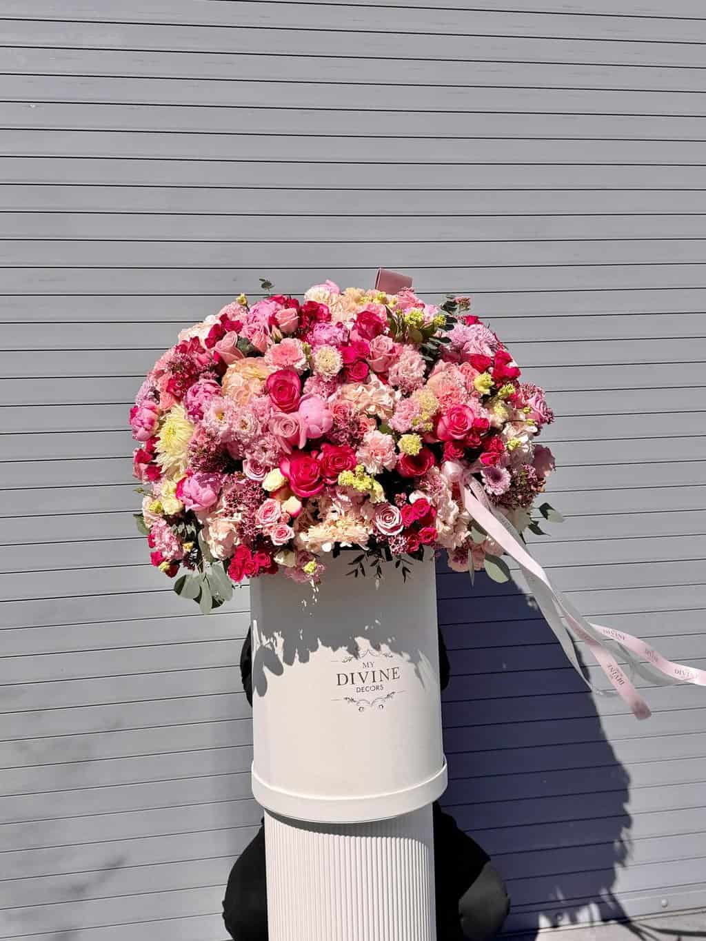 Presented in our white signature My Divine Decors luxury hat box and finished with satin ribbon detailing, this arrangement is the ultimate expression of love, celebration, and divine beauty.