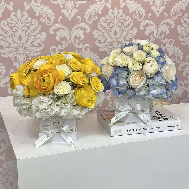 Box size is 6″ ย Arrangements include hydrangeas, roses, spray roses, fillers and greenery if needed. please specify theme/style/colors of event.