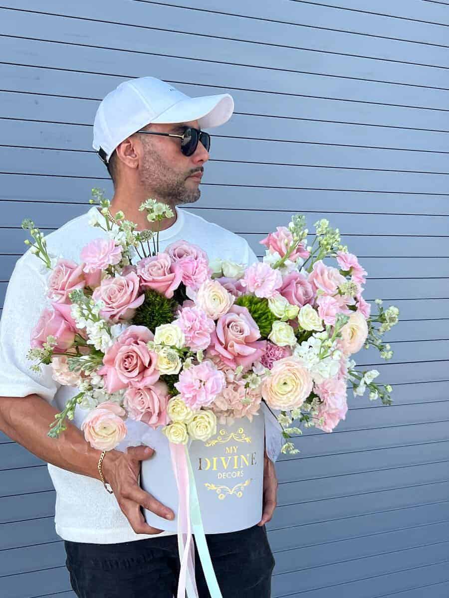 Elevate your gifting experience with our stunning flower arrangement hat box, a true celebration of beauty and elegance. This exquisite arrangement features a harmonious blend of reflexed roses and trendy Russian-inspired blooms, including delicate spray roses, luxurious hydrangeas, charming fillers, and enchanting ranunculus.