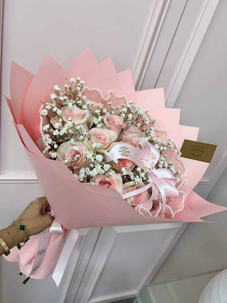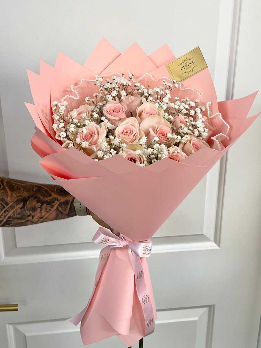 This exquisite hand bouquet features a delicate arrangement of vibrant roses, complemented by the airy, white blooms of baby’s breath. Each rose is carefully selected to ensure freshness and beauty, creating a timeless expression of elegance and affection. The bouquet is meticulously wrapped in high-quality paper, enhancing its natural beauty, and is adorned with a stylish ribbon that adds a touch of sophistication. Perfect for any occasion, from romantic gestures to expressions of gratitude, this bouquet is designed to convey your sentiments with grace and charm.