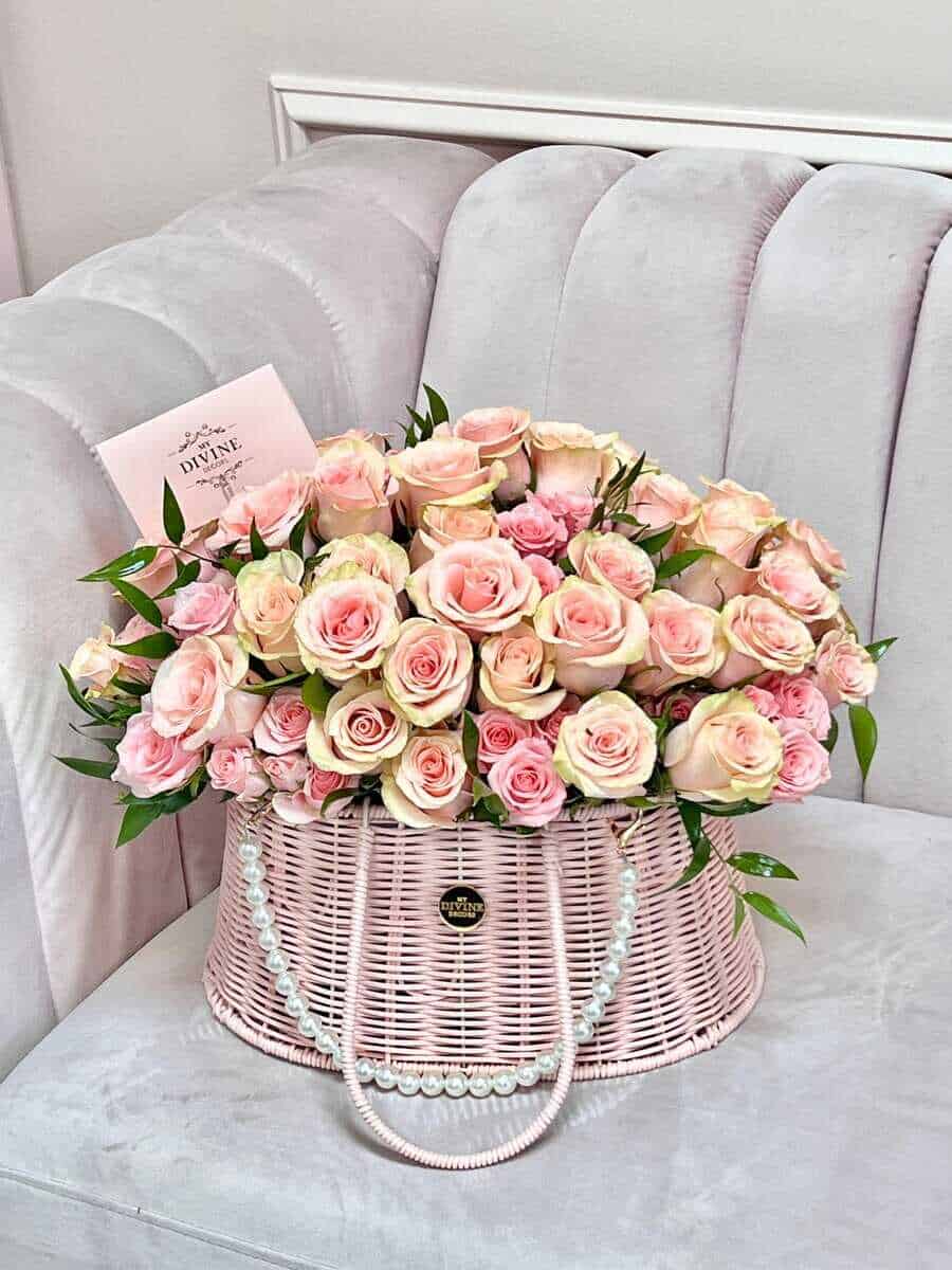 Introducing our elegant arrangement of 25 or 50 fresh cut rose mixed with baby roses. beautifully designed in a classic pearl basket. Each rose is carefully selected for its vibrant color and freshness, creating a stunning focal point perfect for any occasion. The pearl basket adds a touch of sophistication, making this floral display an ideal gift for anniversaries, birthdays, or simply to brighten someone’s day. Enhance your space with this timeless and charming arrangement that exudes beauty and grace.
