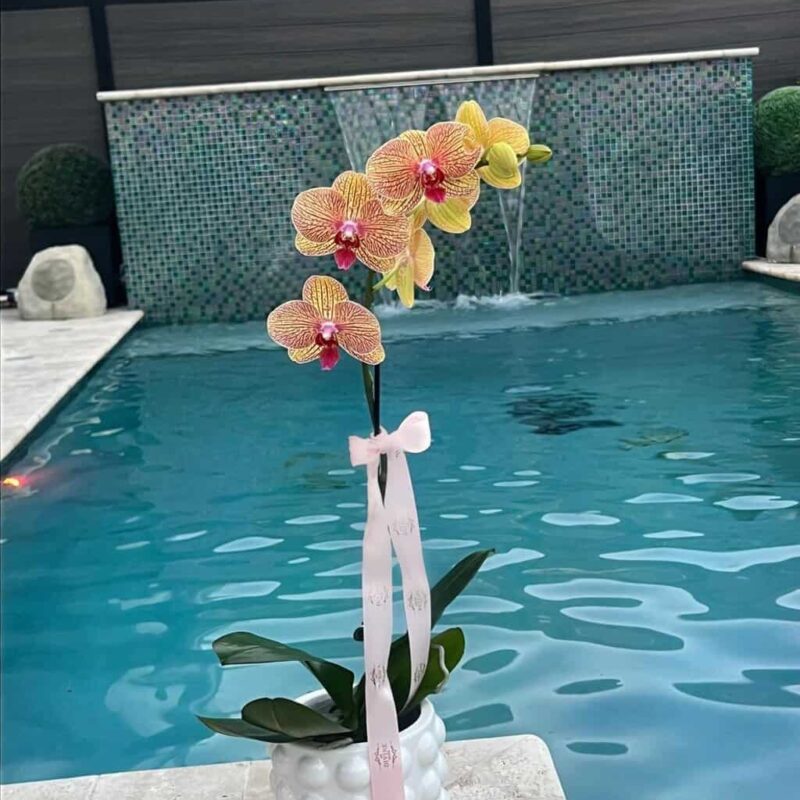Colors and type of orchids may vary based on seasons and availability. Please make a note if you prefer a different color of Orchids white or purple.