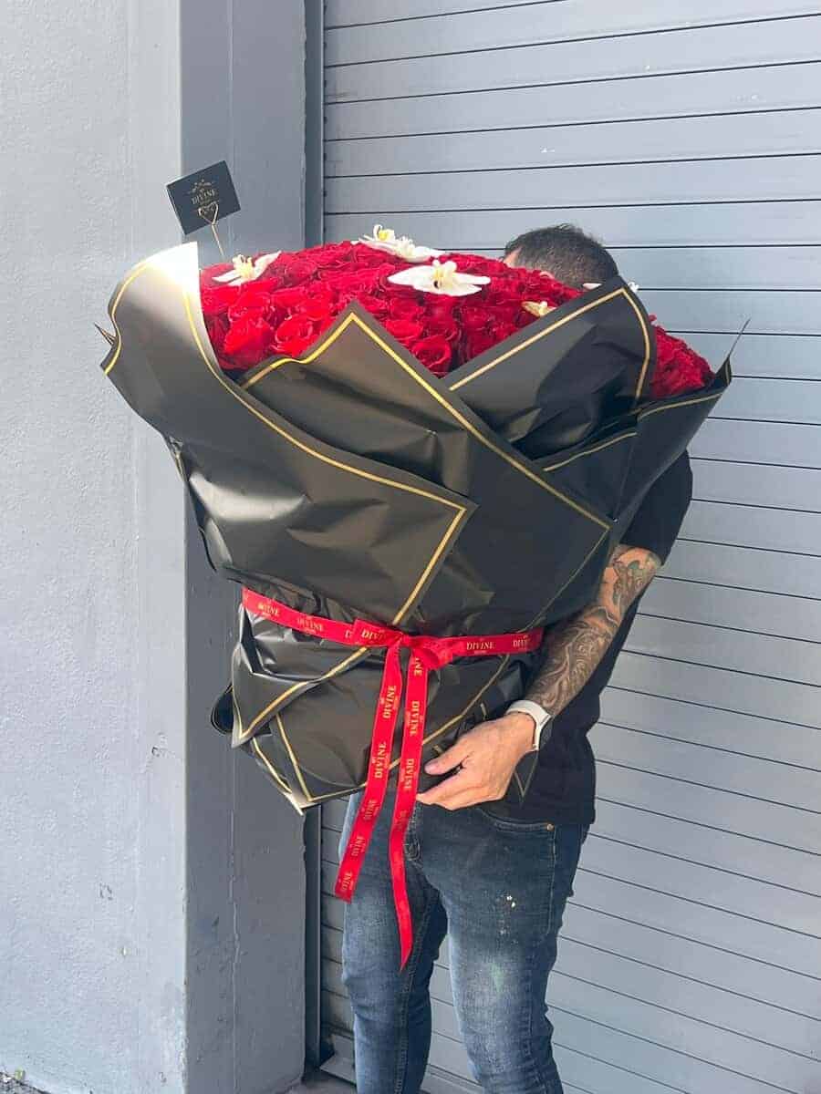 Make the grandest statement with this breathtaking bouquet featuring 200 fresh-cut premium red roses, elegantly wrapped and designed to impress. Delicately accented with butterfly orchids for a touch of sophistication, this bouquet is securely placed in a sturdy box to hold its impressive weight. Perfect for unforgettable celebrations, luxury gifts, or when words simply arenโt enough.