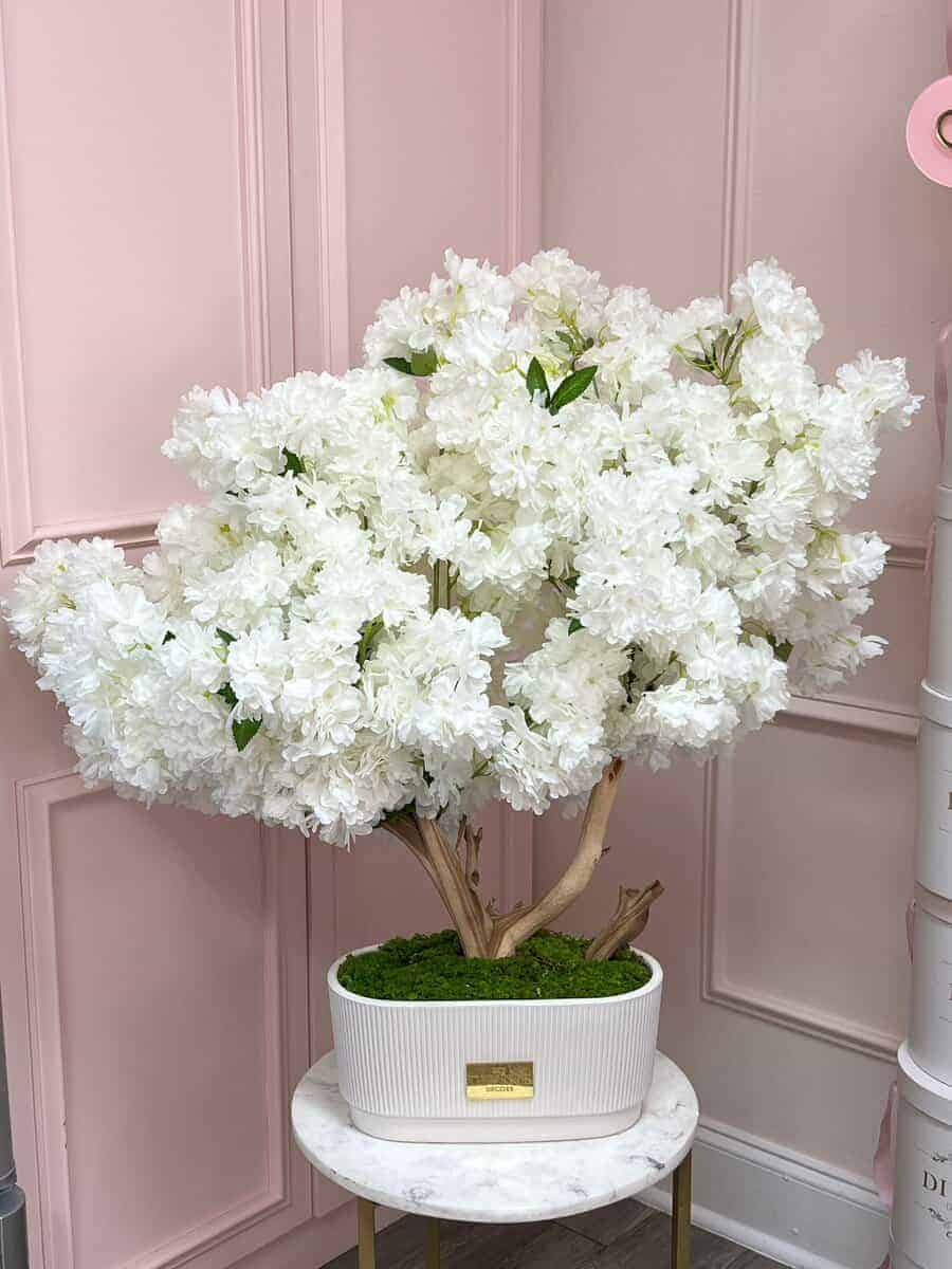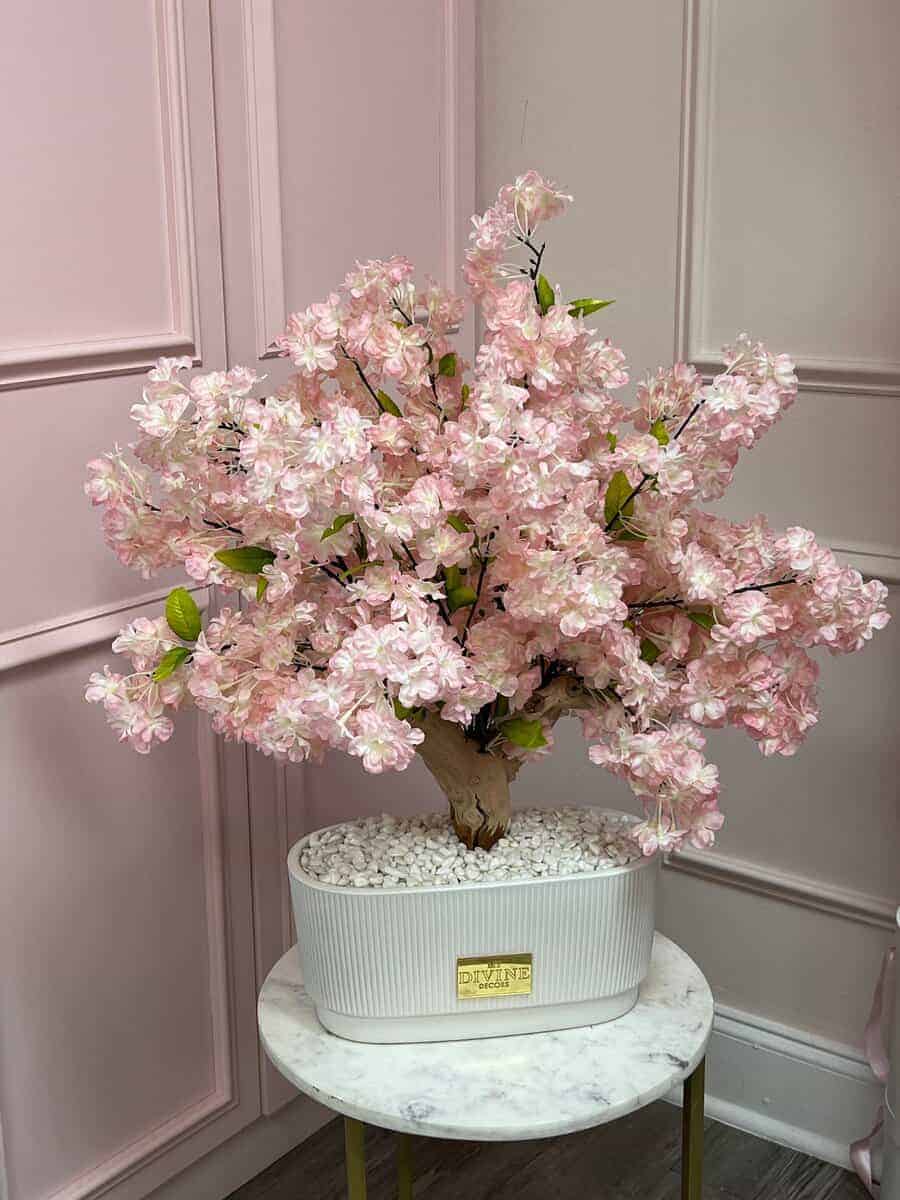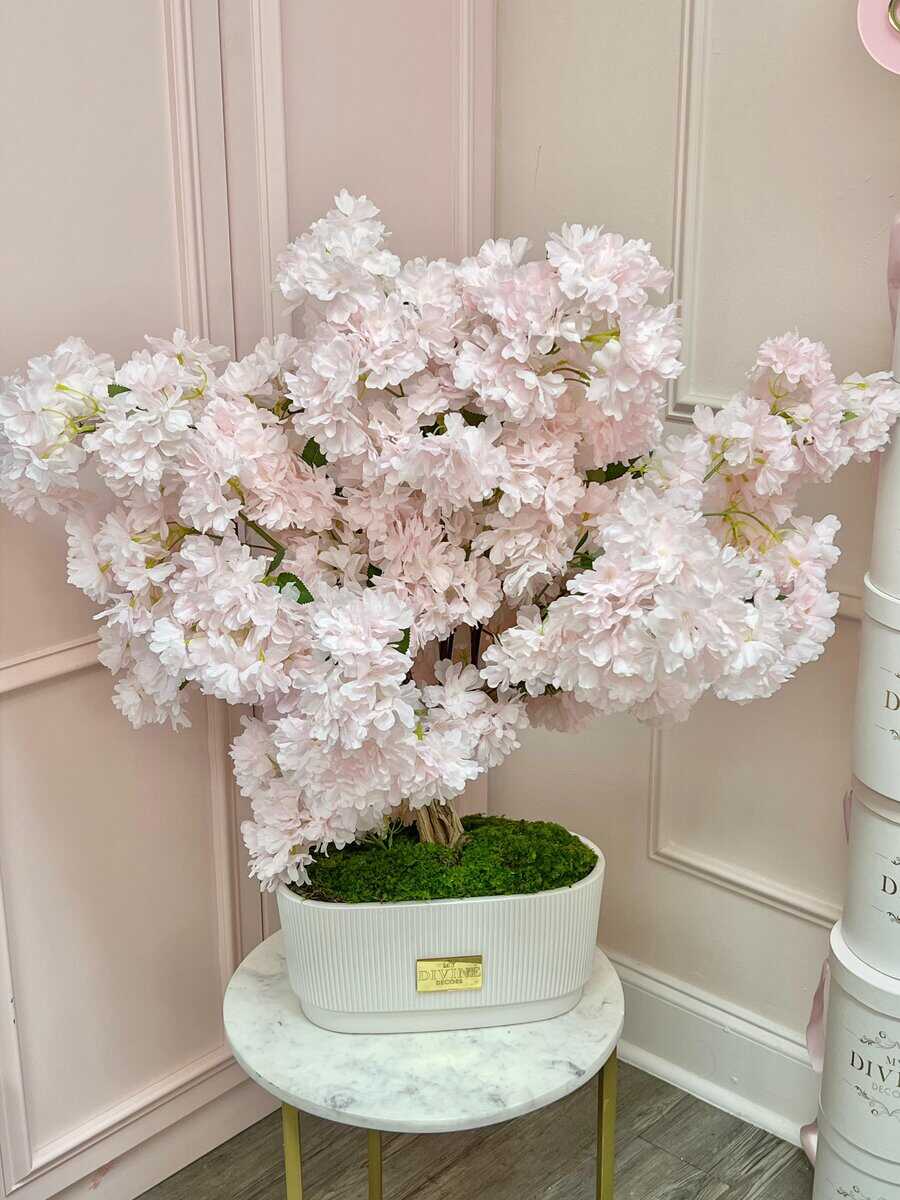 Add timeless elegance to your space with this stunning silk flower arrangement in trending shades of pink. Featuring delicate cherry blossoms and lush mixed florals, each bloom is carefully arranged in a sleek white ceramic vase measuring 11”x5”x6”. Perfect for desks, vanities, or side tables, this piece offers everlasting beauty without the need for maintenance.