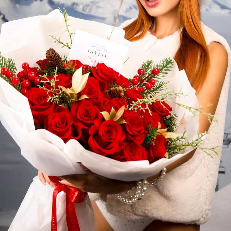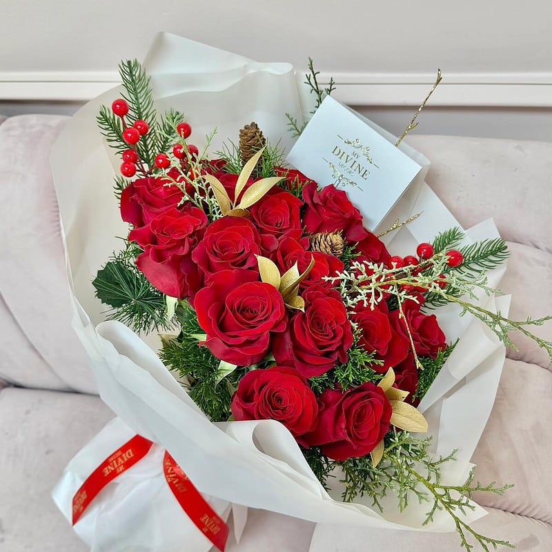 48-55 fresh cut roses decorated with round ball ornaments and bows. Colors and type of roses may vary based on seasons and availability. Please make note of your color of preference for the fresh roses. Includes greeting card.
