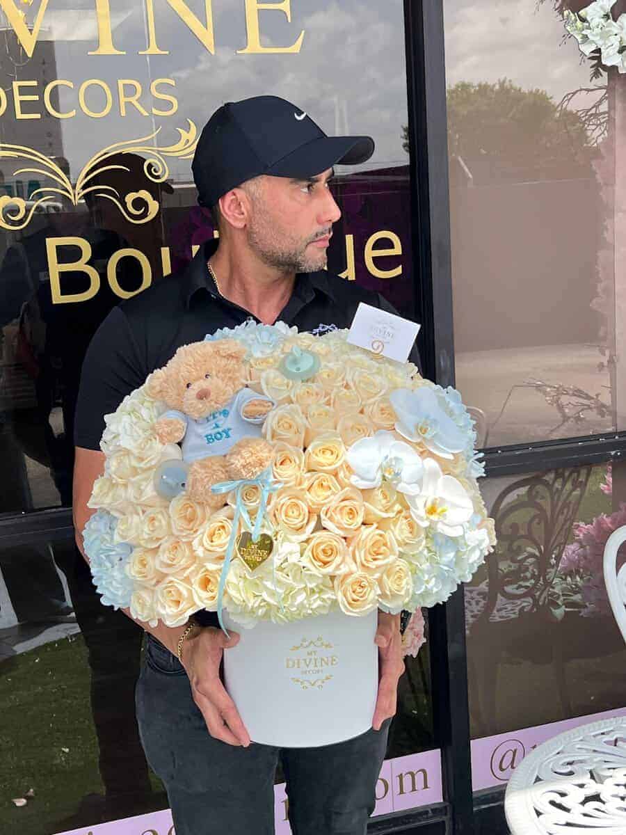 Welcome the new arrival with our stunning Large Baby Hat Box Arrangement, a beautifully curated display designed to celebrate the joy of parenthood. Each arrangement features an elegant mix of fresh flowers, including vibrant hydrangeas, delicate roses, and exotic orchids, all artfully arranged to face forward, creating a striking focal point for any nursery or home.
