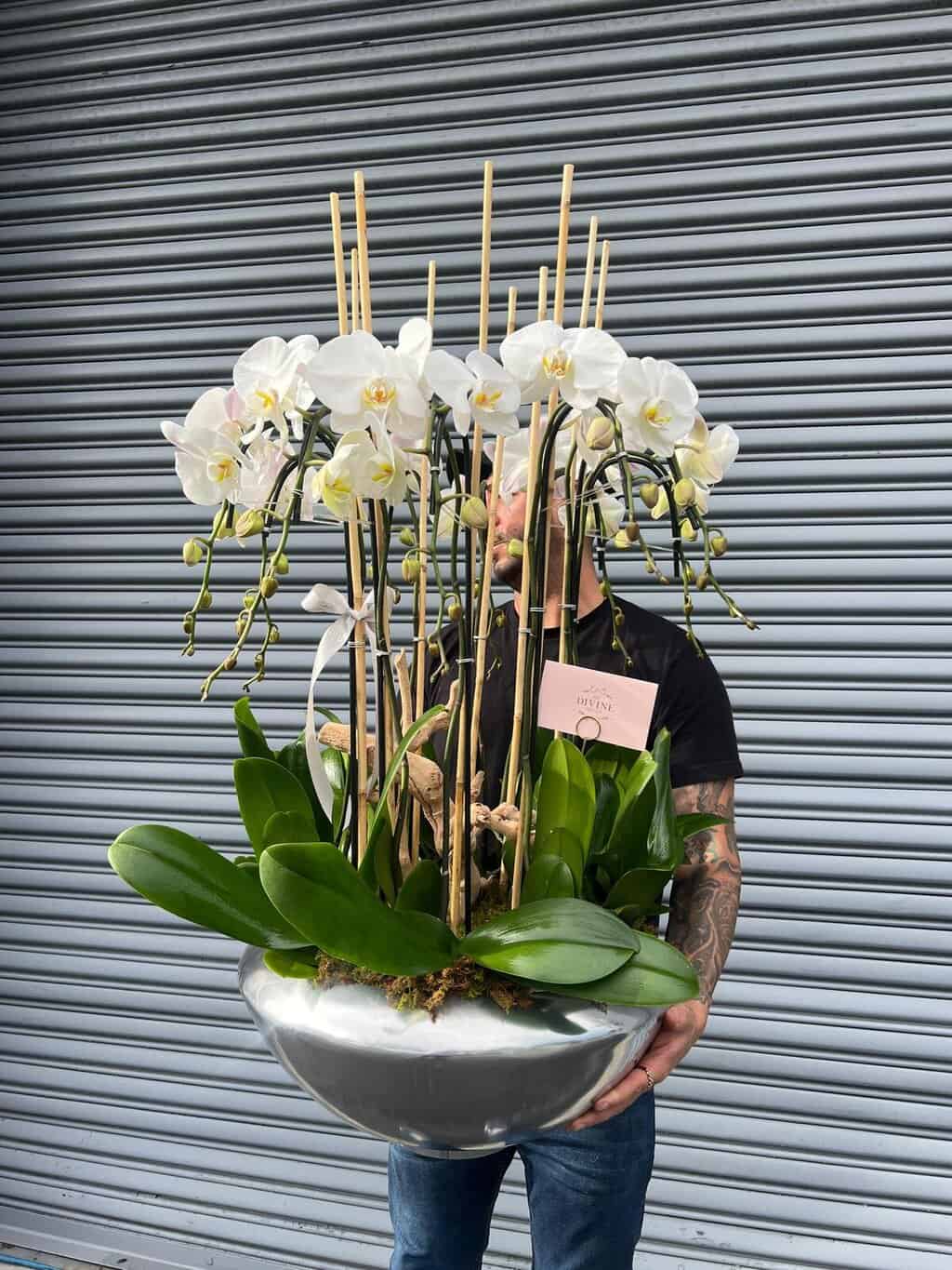Our Majestic Cascade Orchid Garden is the ultimate expression of elegance and grandeur. Featuring 10 cascading white phalaenopsis orchids, gracefully arranged in a luxury silver vase and accented with a natural wooden branch, this masterpiece exudes sophistication. The flowing orchid blooms symbolize purity, strength, and timeless beauty, making this design perfect for corporate spaces, luxury homes, weddings, and unforgettable gifts. A true showstopper, it brings an air of serenity and refinement to any setting.