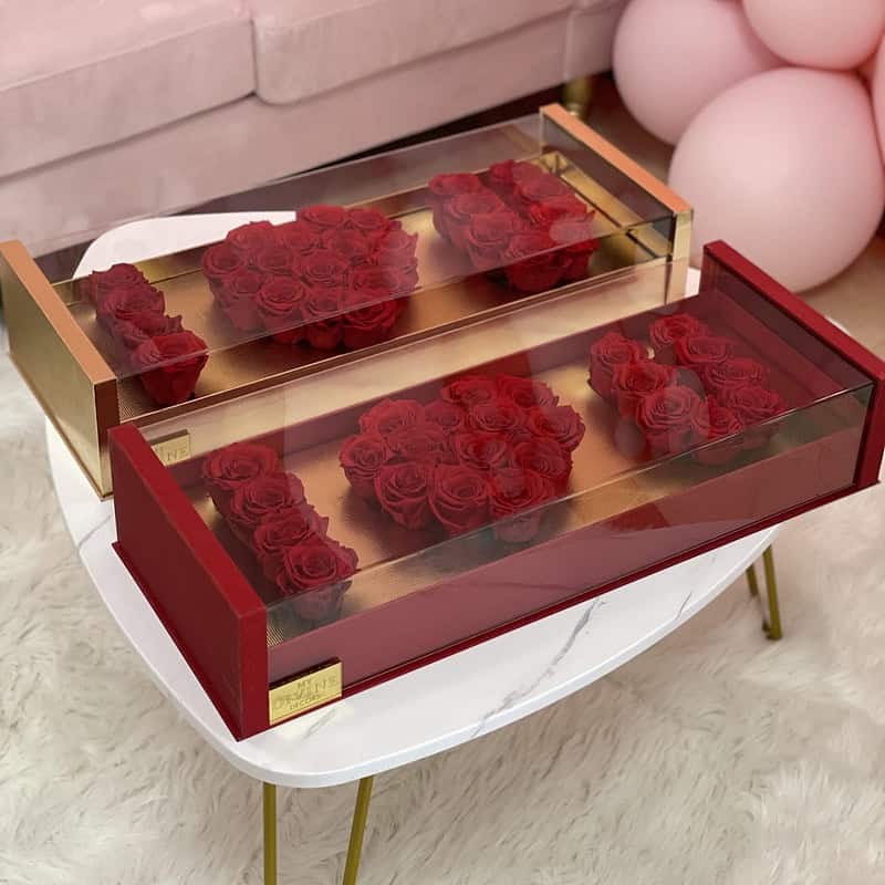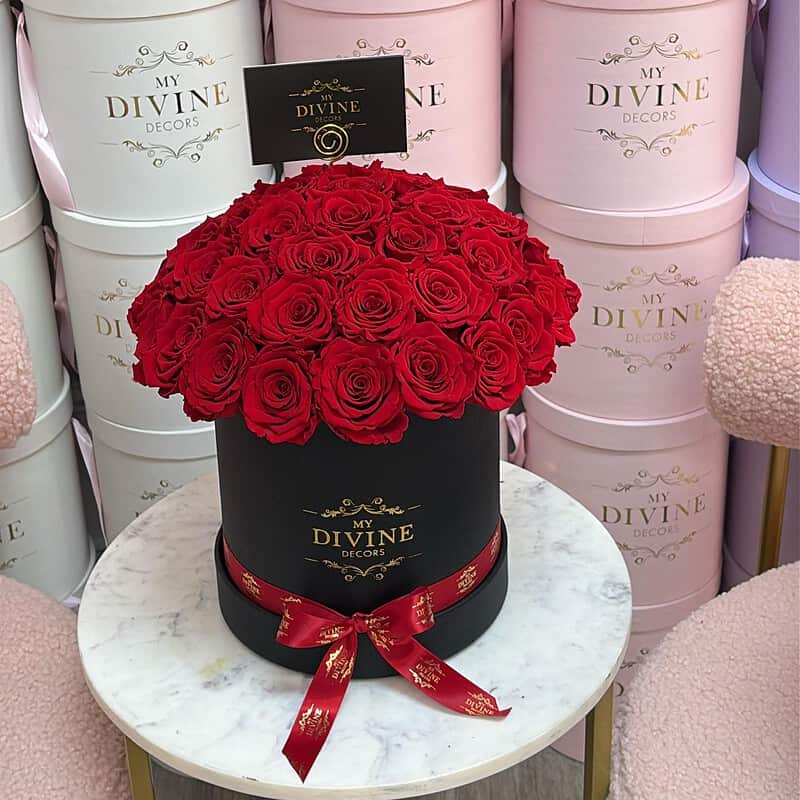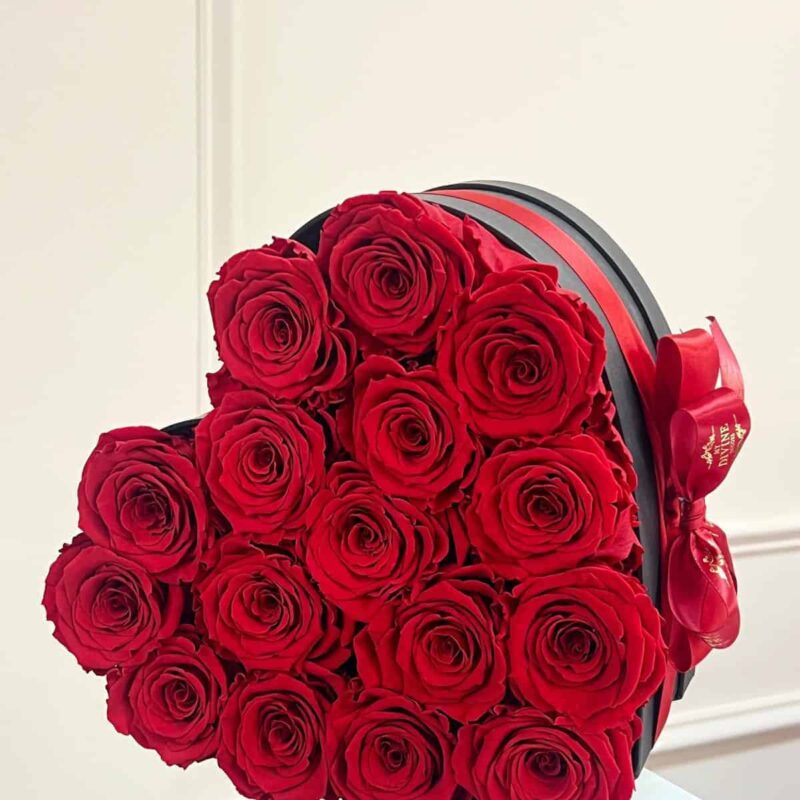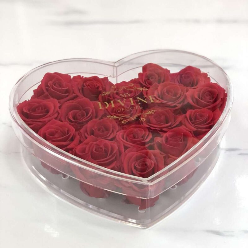 Medium box 6×6″ with 16-18 preserved roses. Please make notes of colors of preference if different.