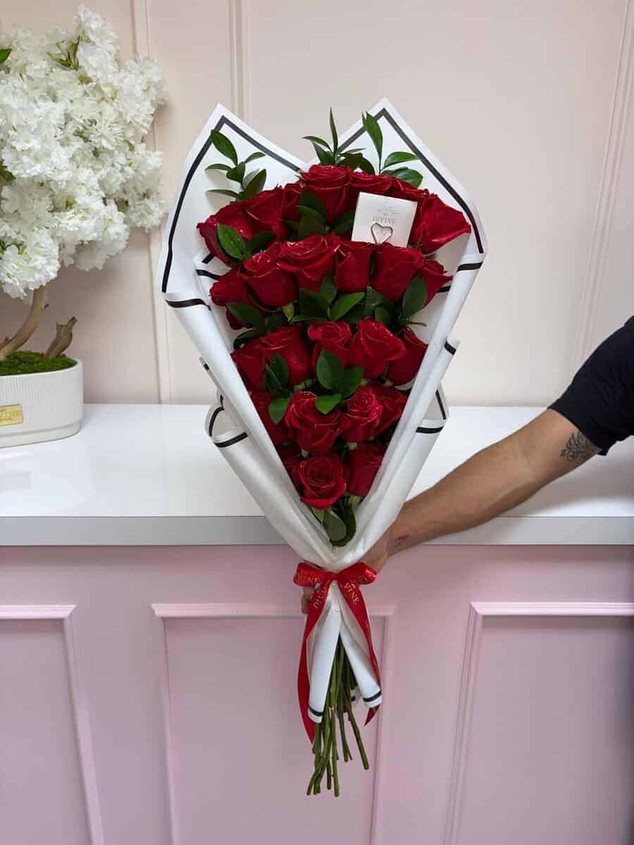 This is a delicate hand wrapped bouquet of roses. Keep in mind these flowers are with no water only wrapped in waterproof paper.