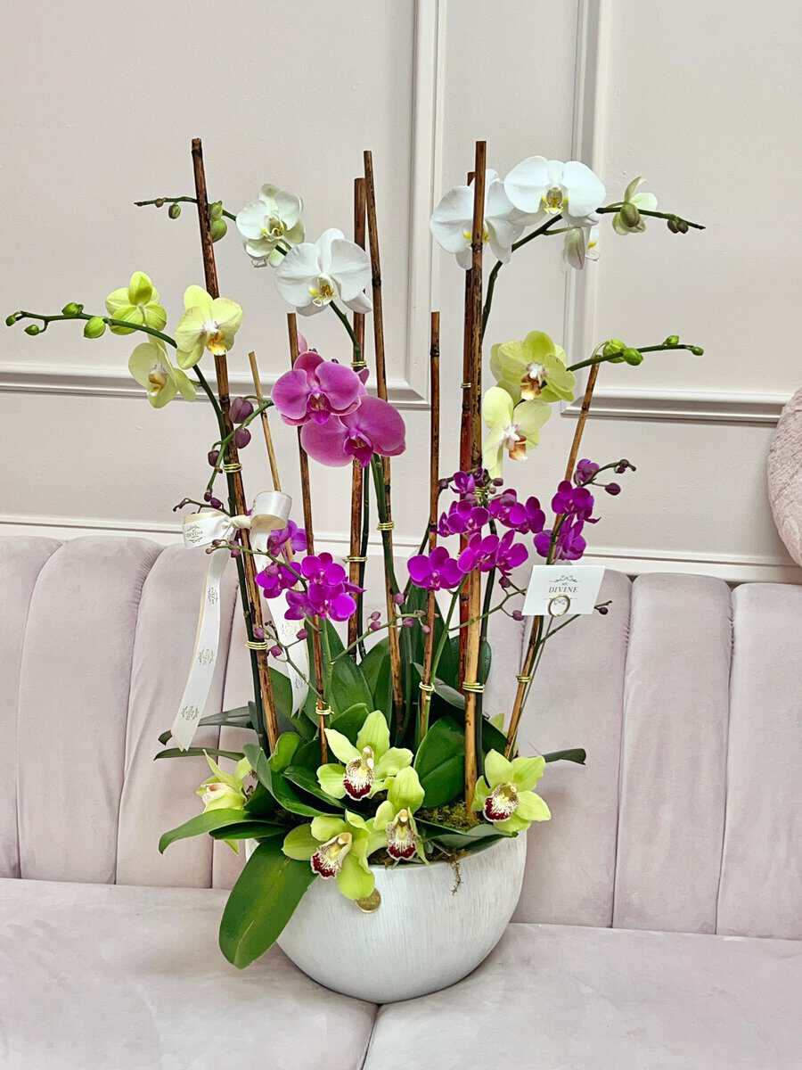 Colors and type of orchids may vary based on seasons and availability. all vases are unique, similar style, not exactly as the picture.