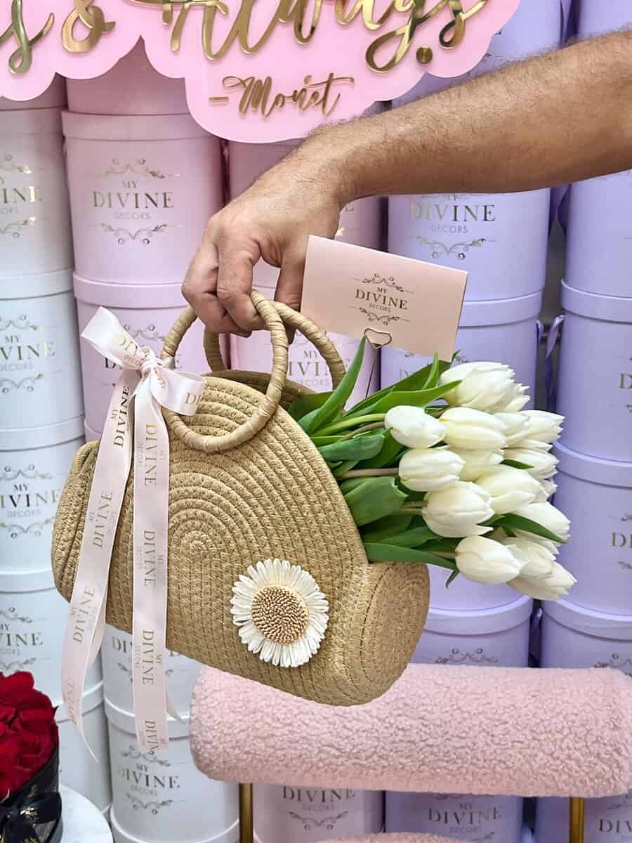 Our newest divine bag is made from woven material, allowing you to choose the flower of your choice with approximately 20 stems. It presents a very chic look.