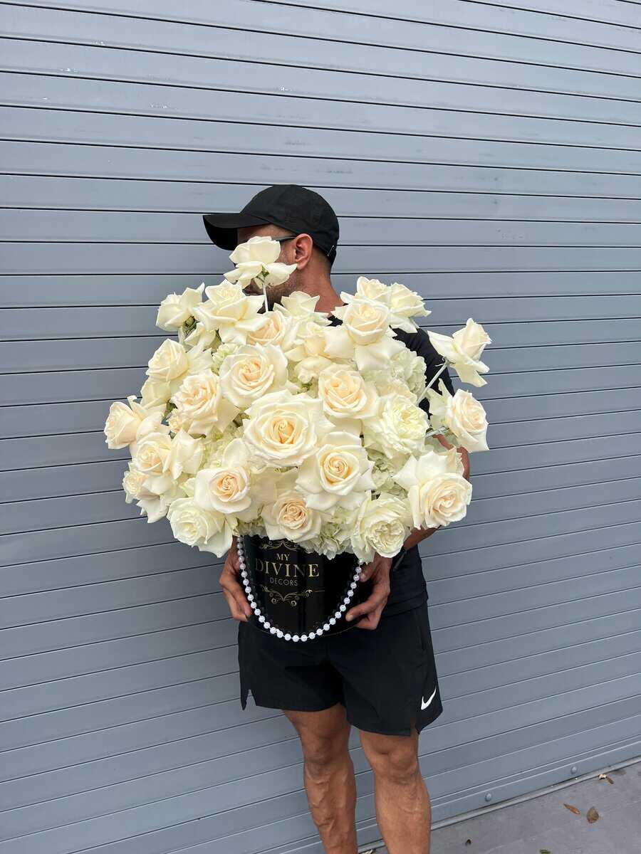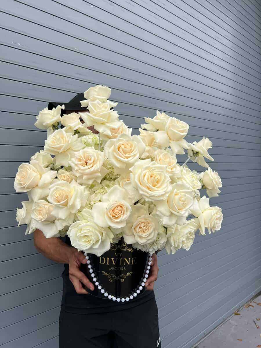 Floral arrangement includes mixed flowers: reflexed Roses, hydrangeas in our Divine Signature box of your preference, greeting card and care instruction card.