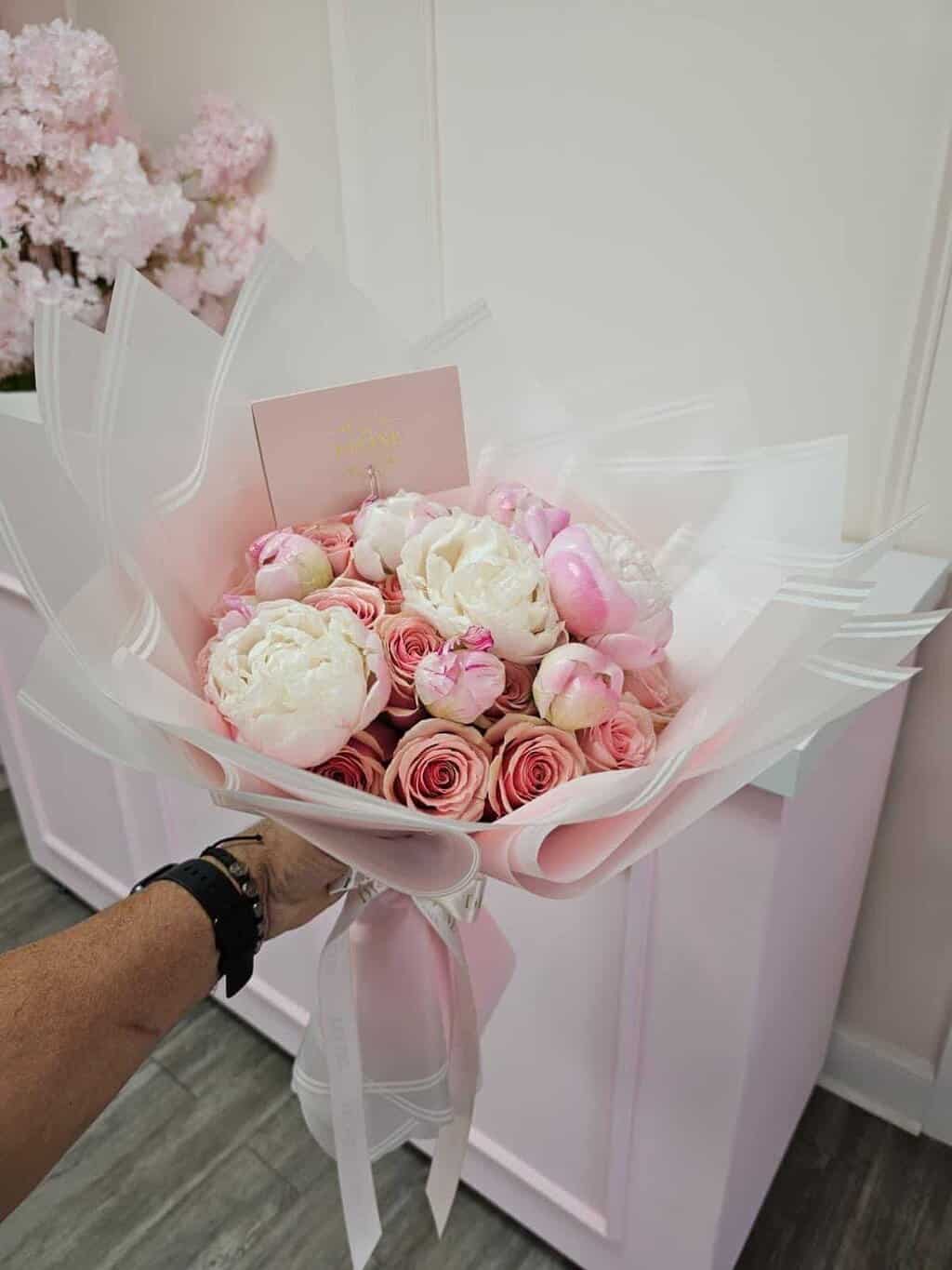 These is a hand wrapped bouquet of mixed roses and fresh picked peonies. (designer’s discretion). Keep in mind these flowers are with no water.