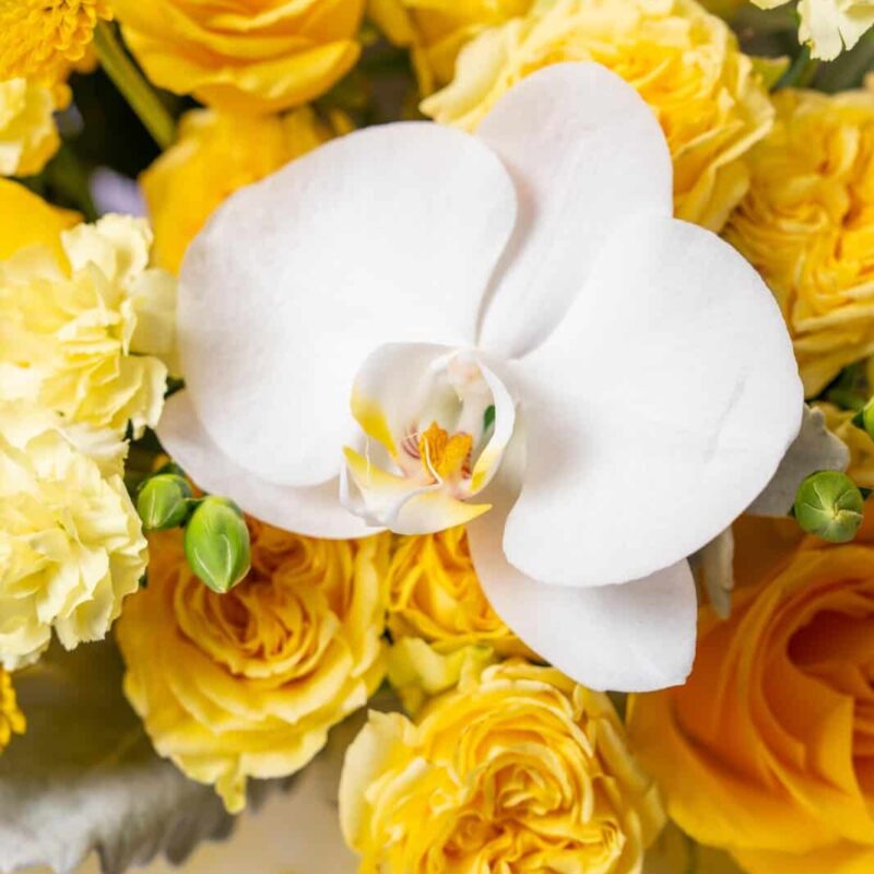 • Flowers: Yellow roses, gerbera daisies, white lisianthus, and seasonal accents
