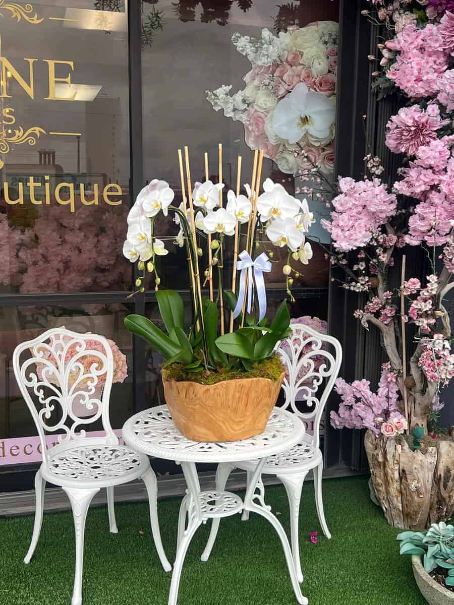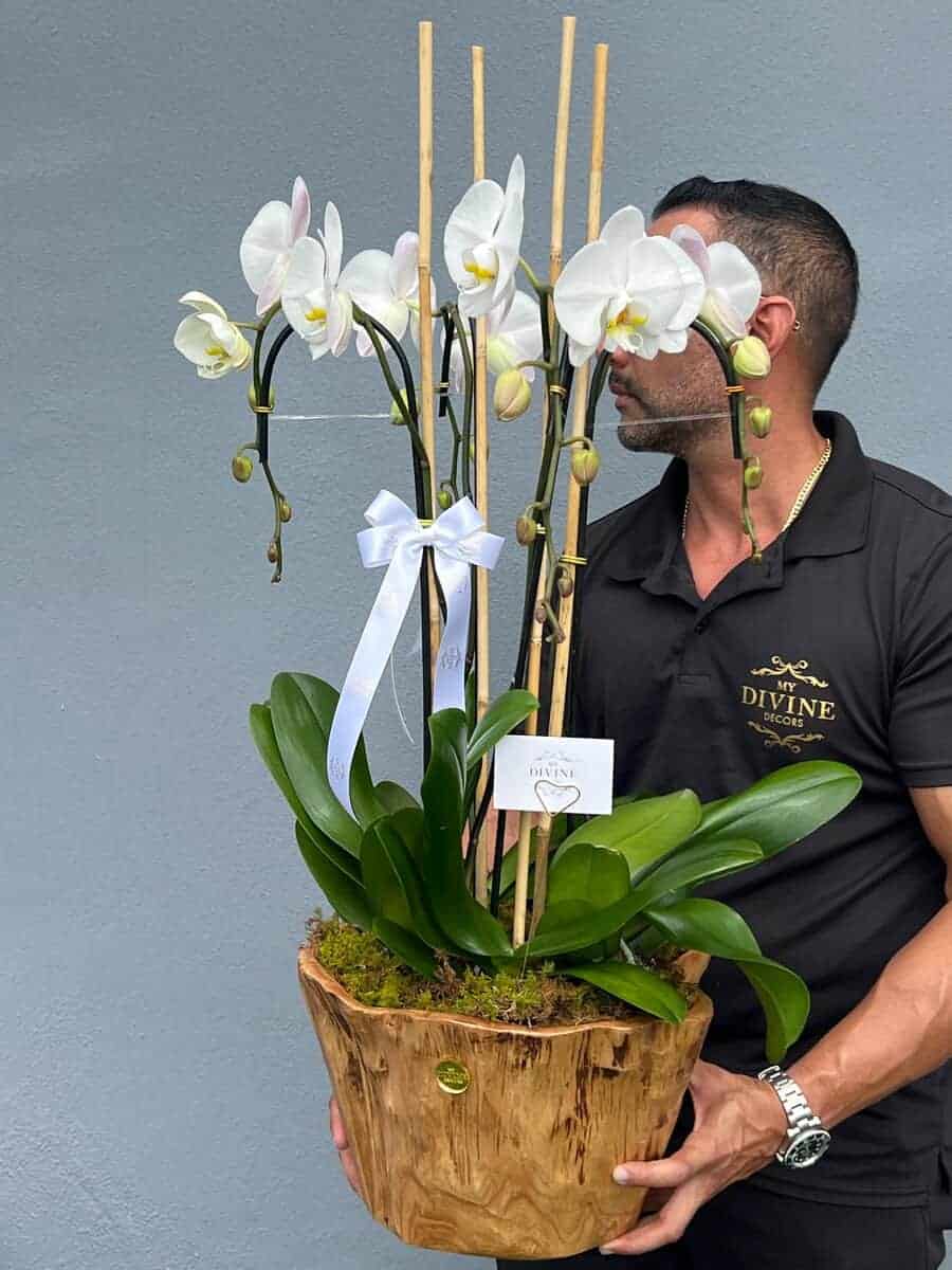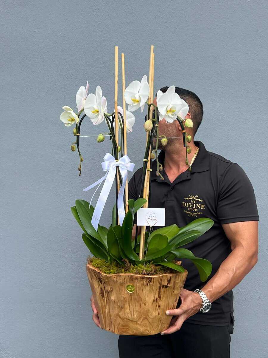Elevate any space with the timeless elegance of our Swan Orchid Arrangement. Featuring four premium Phalaenopsis orchid plants, this design is artfully displayed in a hand-carved natural wood vase that adds warmth and sophistication. Each orchid stem is supported for graceful height and movement, with pristine white blooms that symbolize purity, beauty, and luxury.
