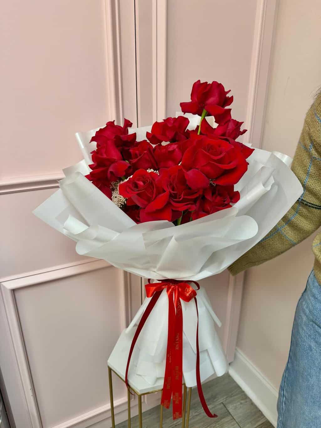 This stunning hand-tied bouquet features premium long-stem red roses, artfully arranged and wrapped in our signature soft white korean paper, finished with an elegant red ribbon.