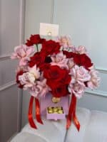 This luxurious arrangement features a harmonious blend of premium red and blush pink roses, carefully hand-arranged in our signature My Divine Decors pink hat box. Finished with custom satin ribbons and a gold heart detail, this piece is elevated with a hidden drawer filled with Ferrero Rocher chocolates, adding a thoughtful touch of indulgence.