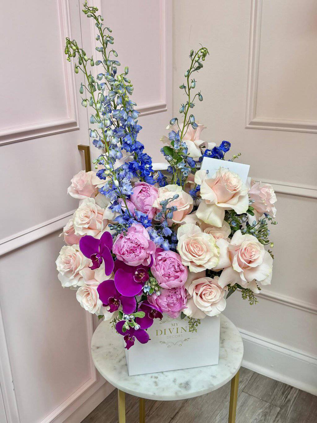 A breathtaking statement of elegance and romance, this lush arrangement features a refined blend of blush and ivory long-stem roses, soft pink garden peonies, vibrant phalaenopsis orchids, and delicate blue delphinium accents. Designed with graceful height and movement, this piece creates an elevated, garden-inspired look that feels both timeless and luxurious.