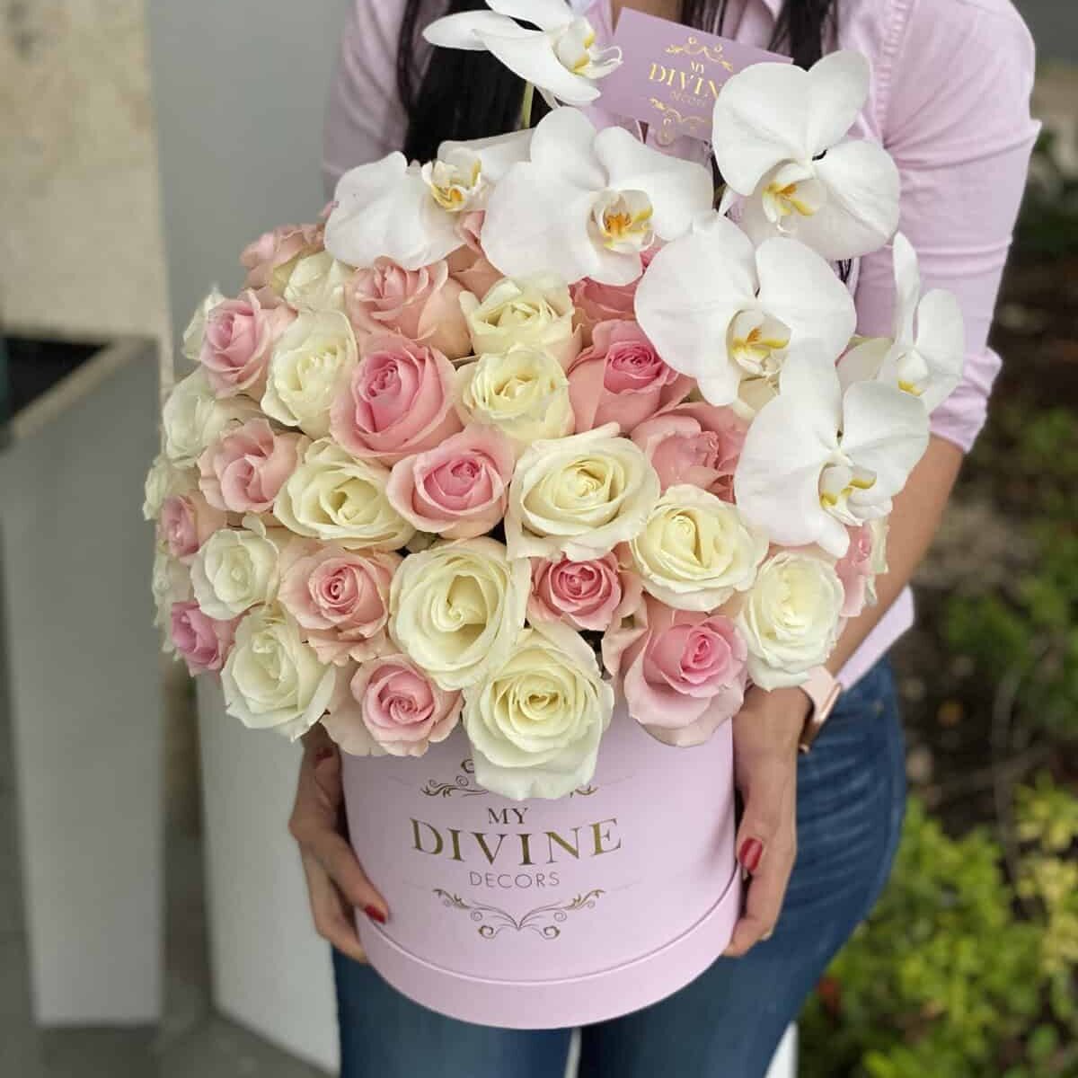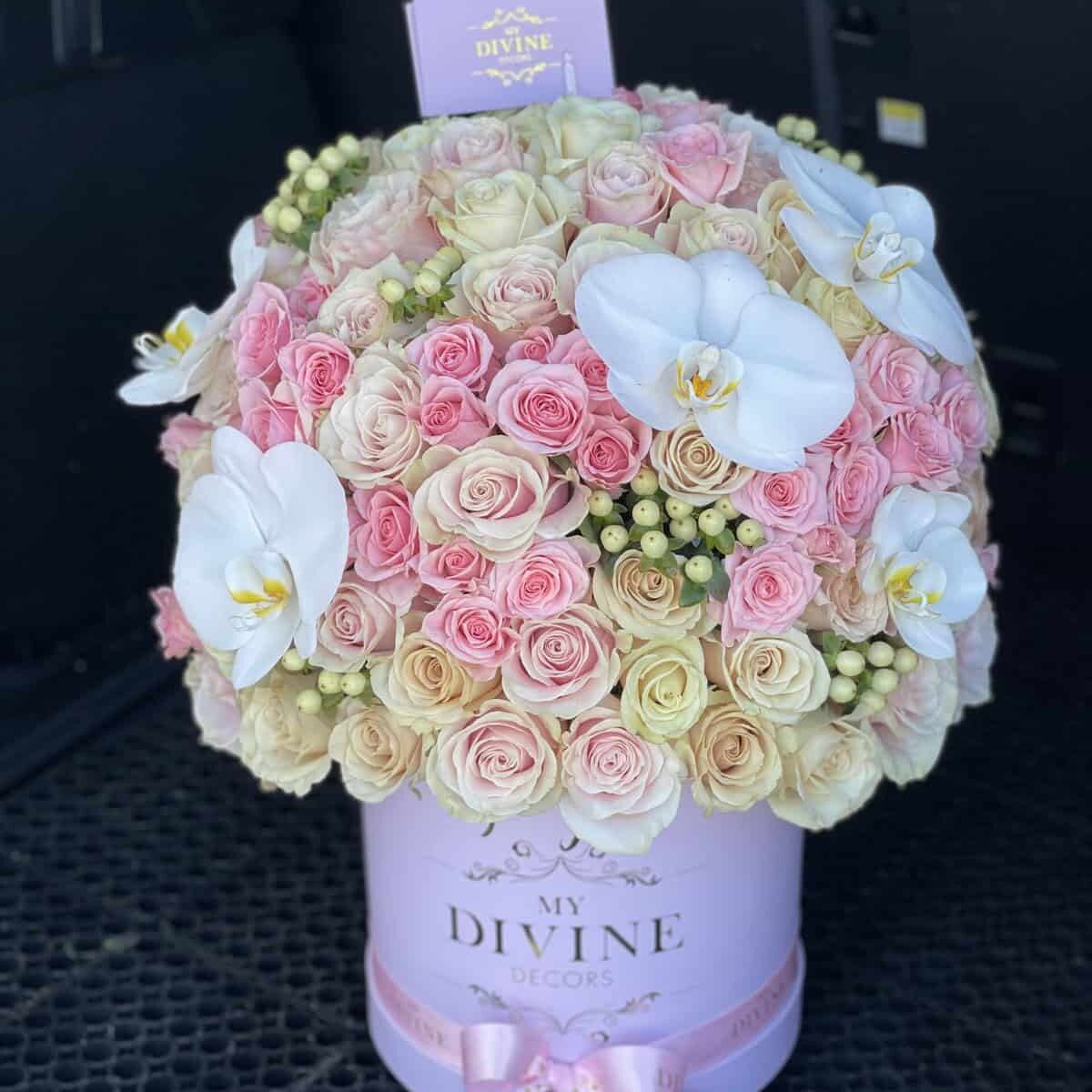 Includes 75-85 fresh cut roses and large phalaenopsis orchids.