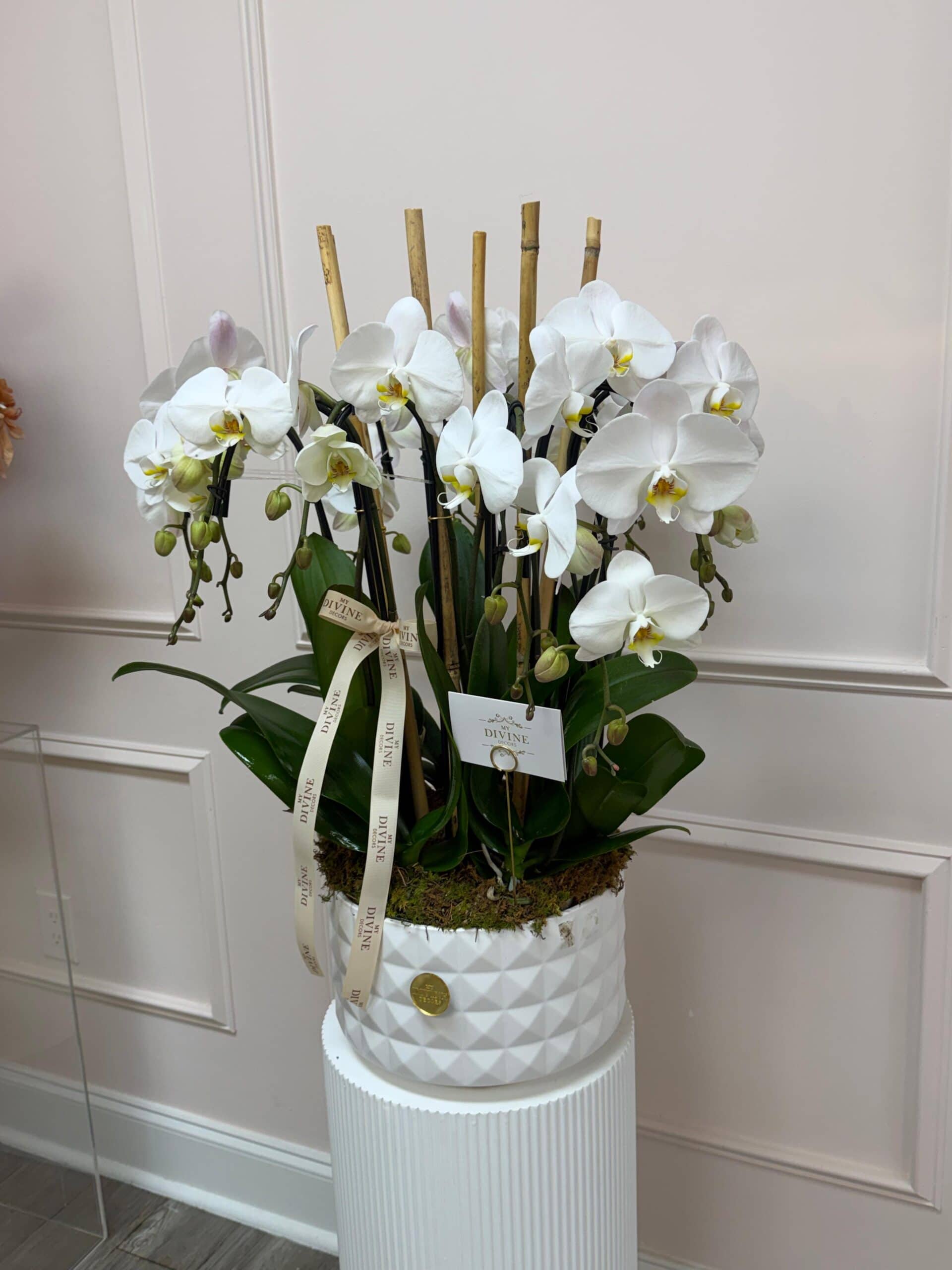 A timeless statement of elegance, our Divine Orchid arrangement features multiple premium white phalaenopsis orchids beautifully arranged in our signature textured ceramic bowl. Designed with lush green foliage, natural moss accents, and delicate bamboo supports, this arrangement brings a refined, serene presence to any space.
