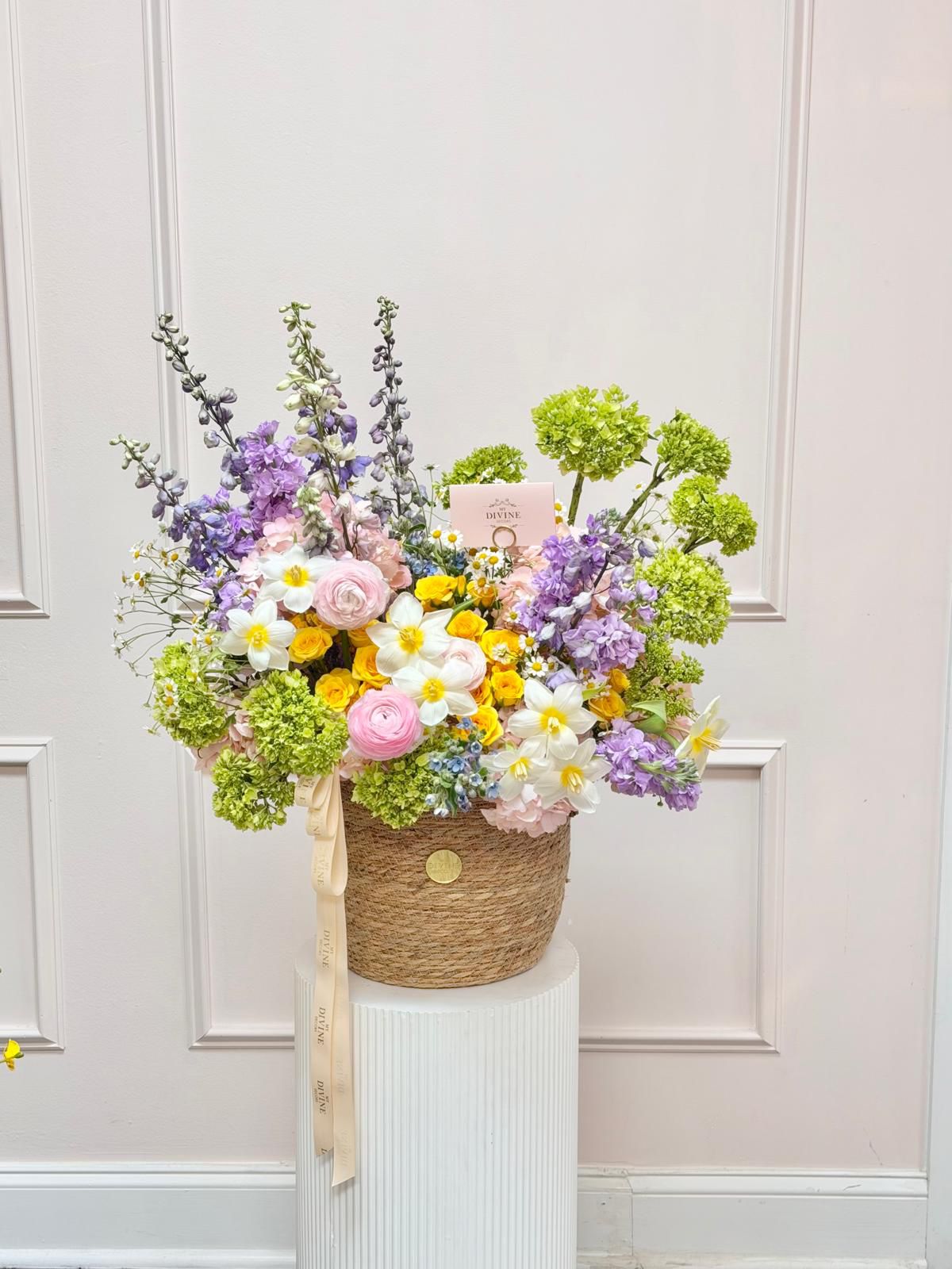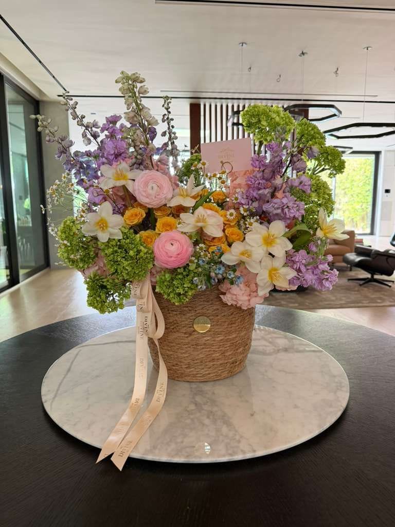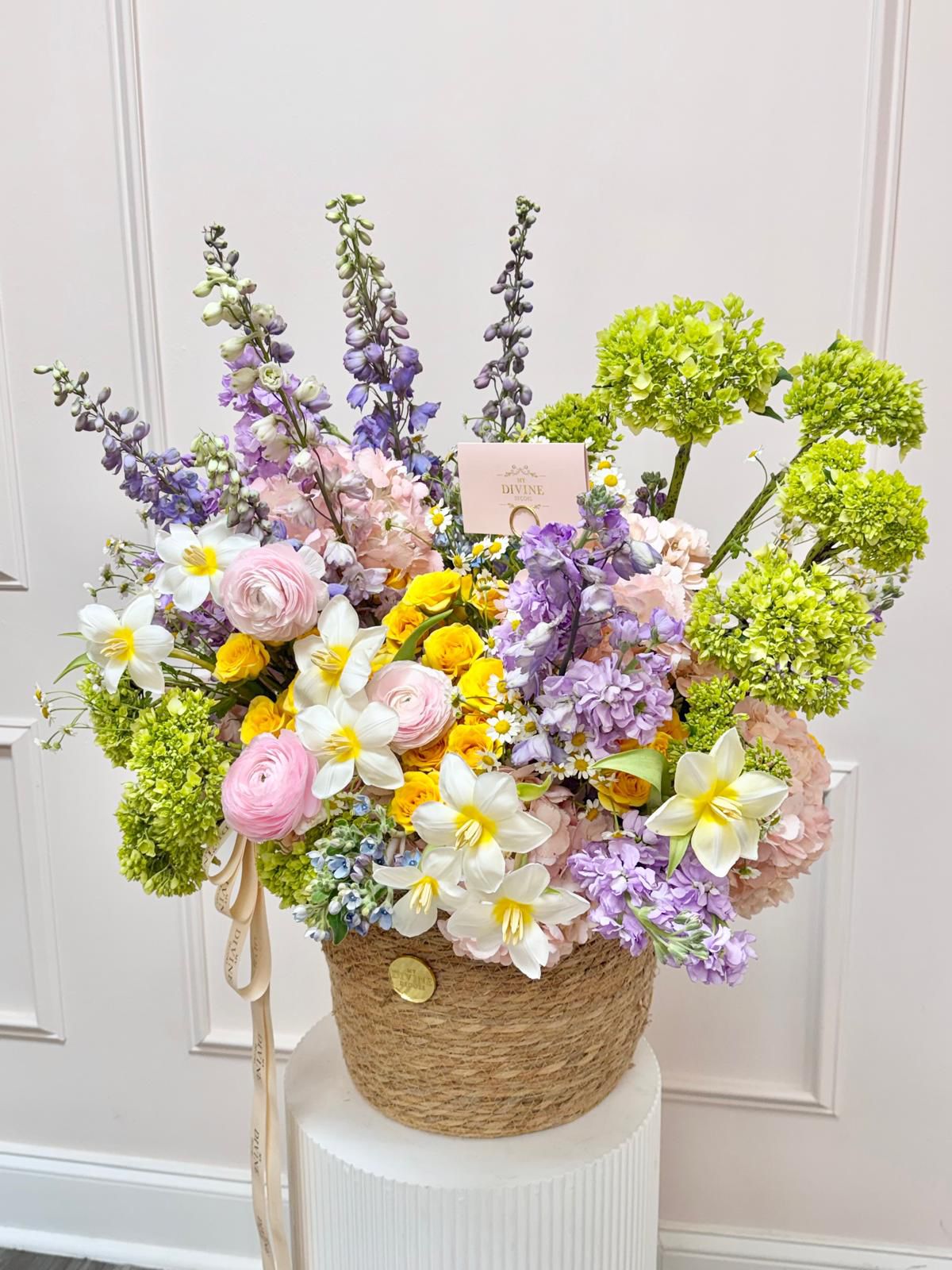 A dreamy celebration of spring, Primavera di Positano captures the essence of soft coastal elegance and blooming beauty. Designed in a natural woven basket, this arrangement features a luxurious mix of ranunculus, garden roses, hydrangeas, delphinium, and delicate seasonal blooms in pastel shades of blush, butter yellow, sky blue, and fresh greens.