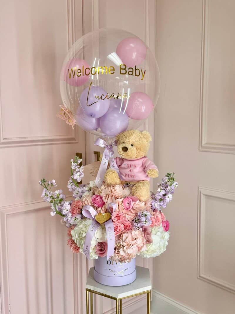 This stunning piece features a lush arrangement of soft pastel floralsโincluding hydrangeas, roses, and delicate seasonal bloomsโartfully arranged in our signature luxury hat box. Topped with an oversized personalized clear balloon filled with pastel balloons and accented with a charming plush teddy bear, this arrangement makes the perfect statement for hospital deliveries, baby showers, or a heartfelt welcome home.