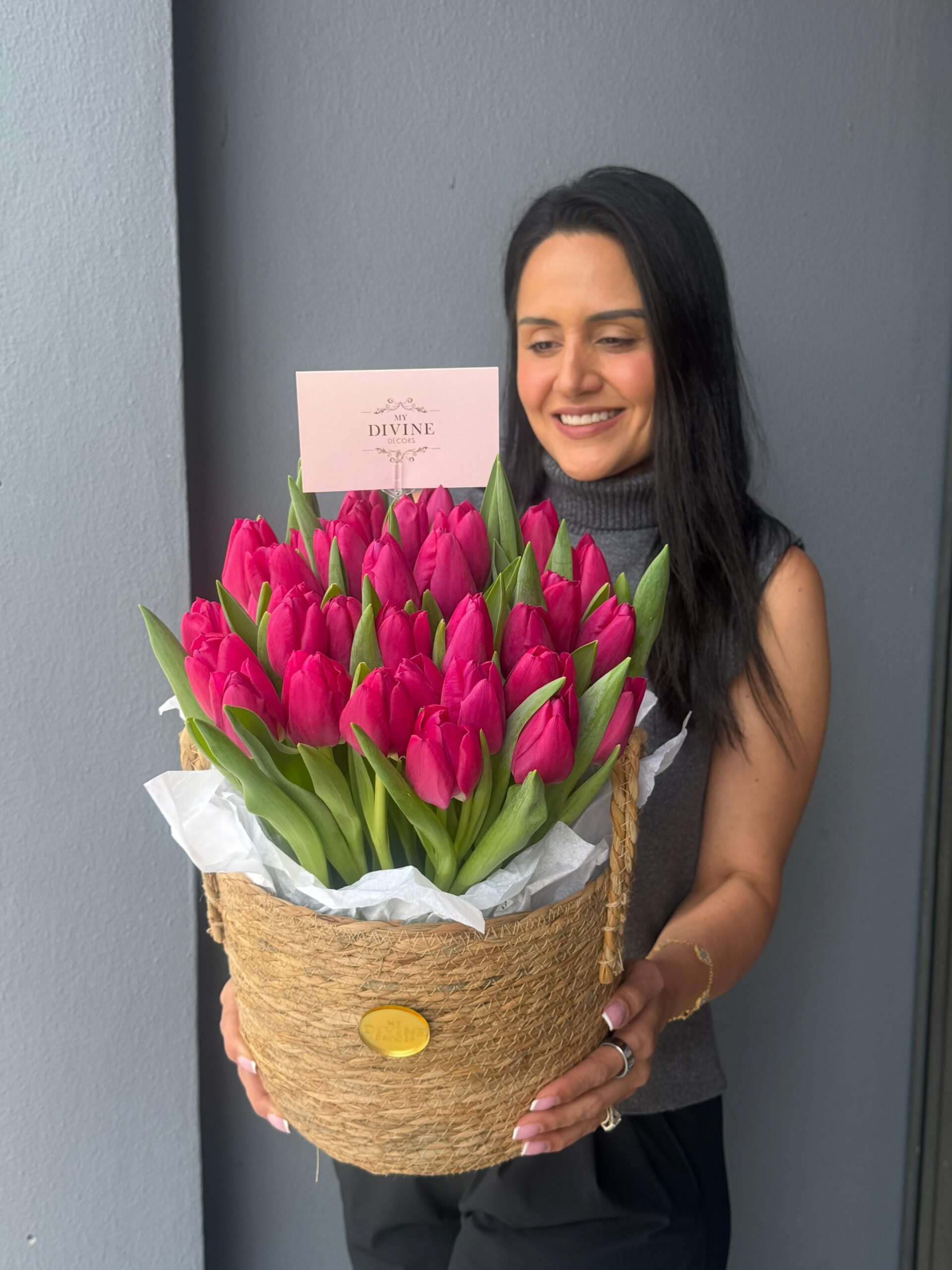 Our Pink Garden Tulip Basket features an abundant arrangement of premium hot pink tulips, beautifully gathered in our signature woven natural basket. The vibrant blooms are complemented by their lush green leaves, creating a full, garden-inspired look that feels both sophisticated and effortlessly chic.