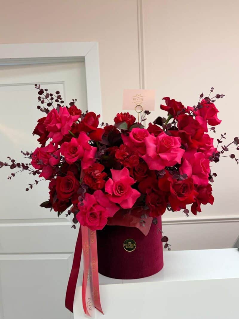 Handcrafted in our signature velvet-style hat box, this luxurious piece is overflowing with rich crimson blooms, accented with delicate touches of greenery for a modern, couture finish. Perfect for anniversaries, Valentineโs Day, birthdays, or any moment that deserves unforgettable beauty.